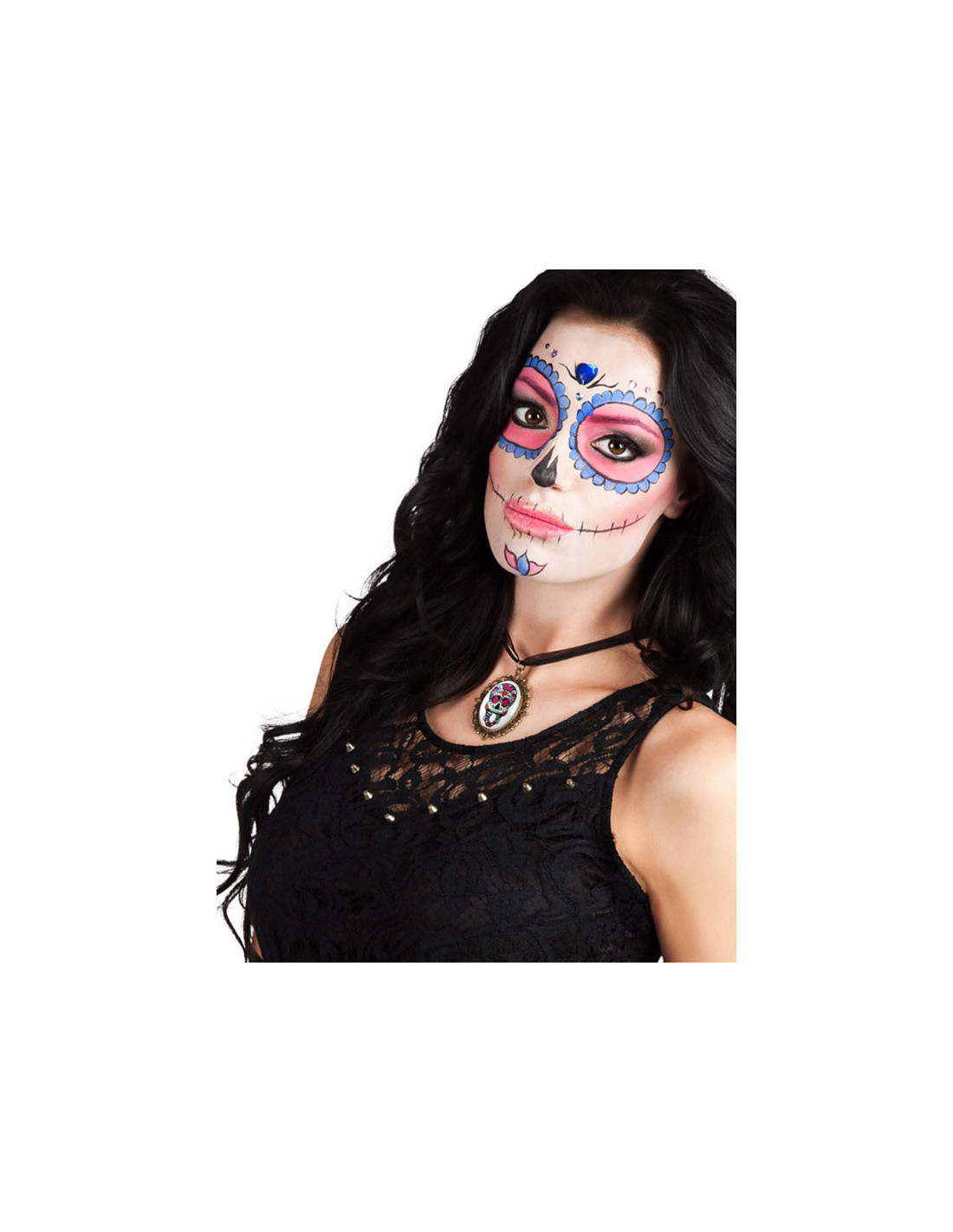 Colgante de calavera Catrina en metal que incluye cordón con cierre y colgante de un camafeo con calavera.