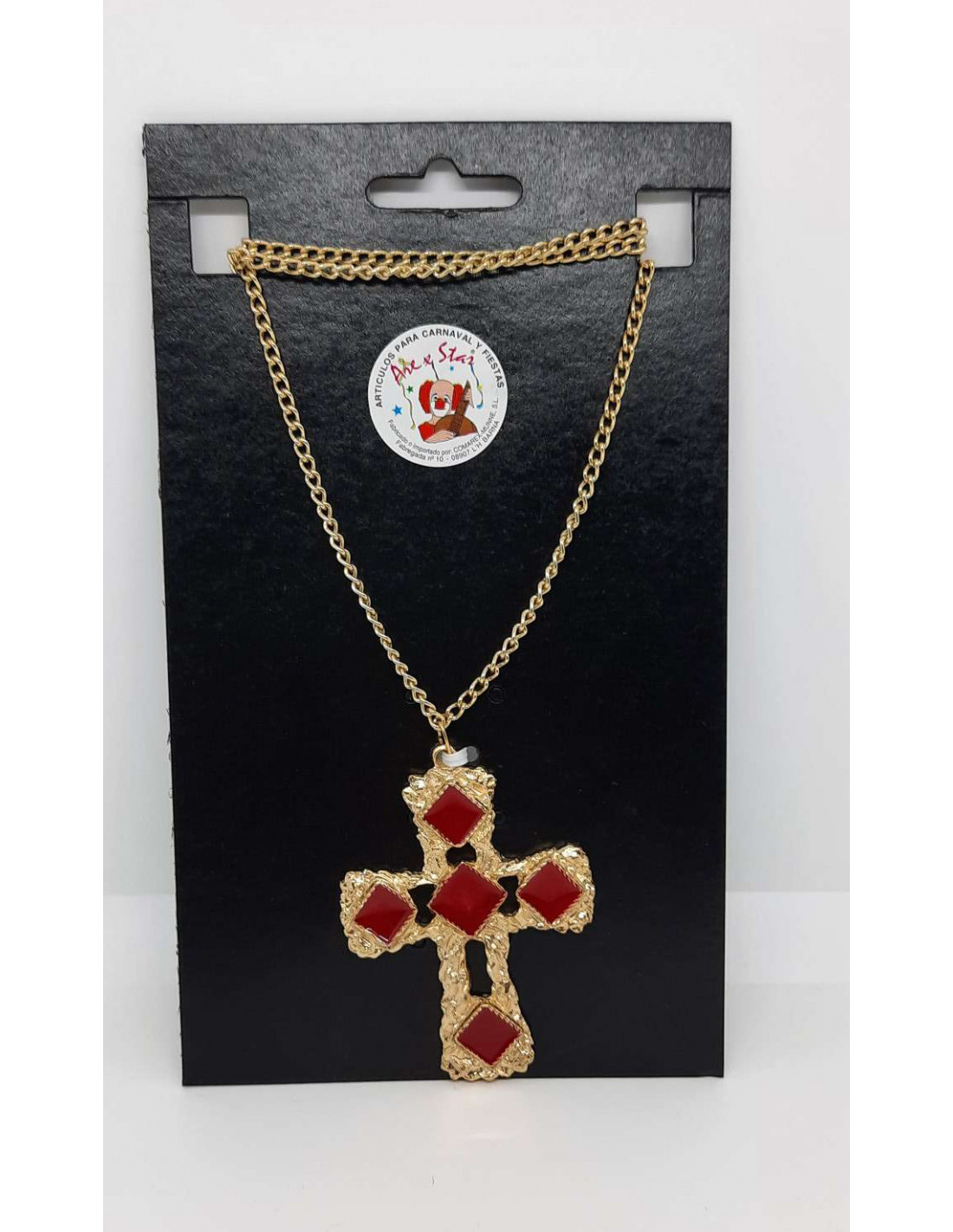 Contiene una cadena metálica dorada y una cruz de metal dorada con apliques y un tamaño de 7x5,5cm.