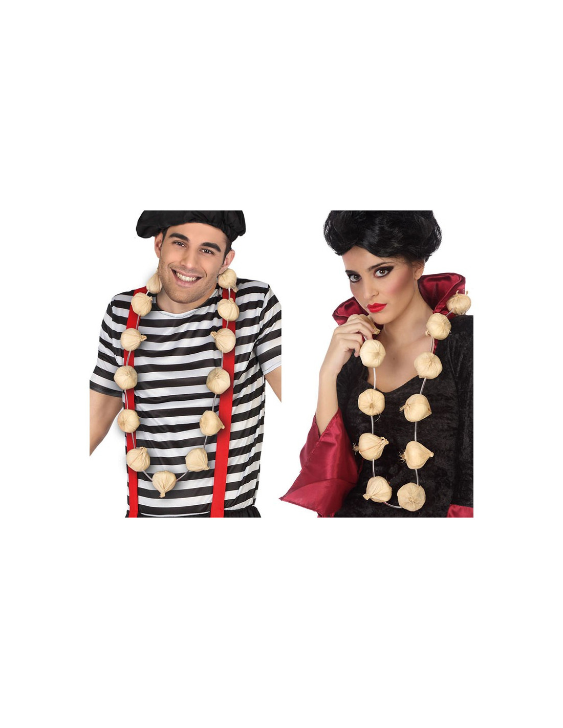 Aleja a los vampiros con este Collar de ajos. Ya tienes el repelente perfecto para que esos 'chupa sangre' no se acerquen a ti. Disfrázate con tu pareja de vampiro y tú de víctima con tu collar de ajos, agua bendita y una cruz.