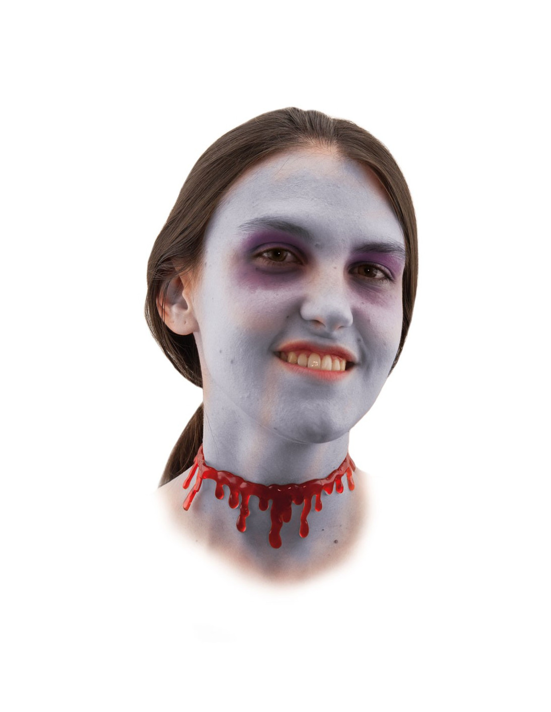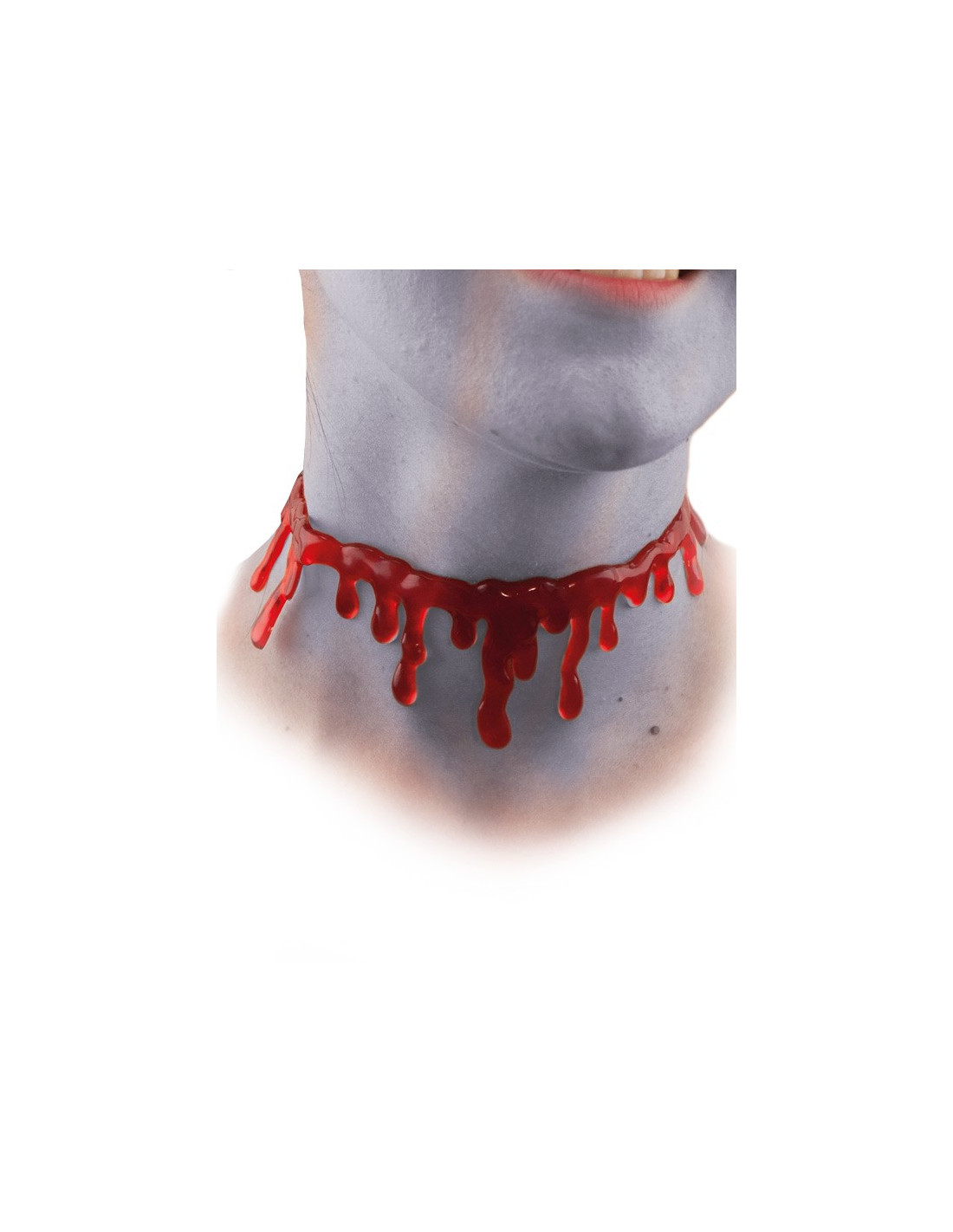 Muestra tu escalofriante cuello con este collar de sangre que simula un cuello desgarrado sangrando. Ideal para tu disfraz de muerta o zombie en Halloween.