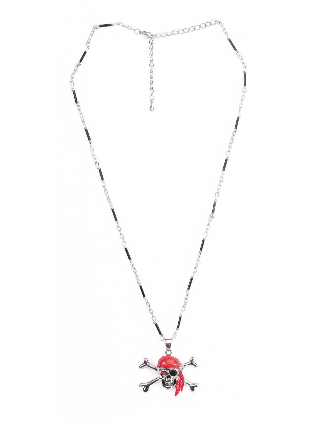 Collar pirata metálico formado por una cadena y una calavera a la que no le falta detalle.