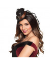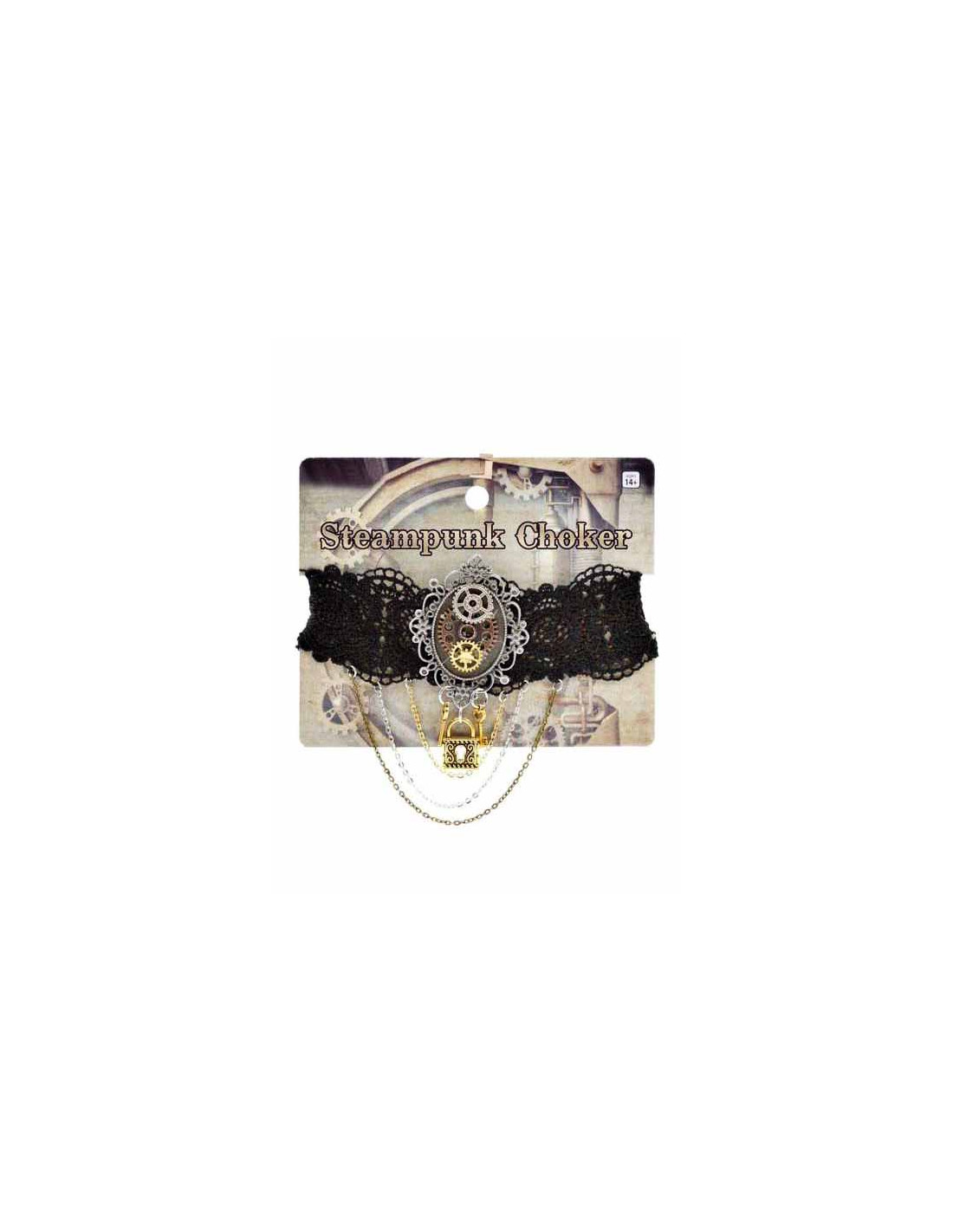 Collar steampunk negro de tela con puntilla negra, decorada con cadenas y un broche. Tu complemento indispensable para tu disfraz de Steampunk.
