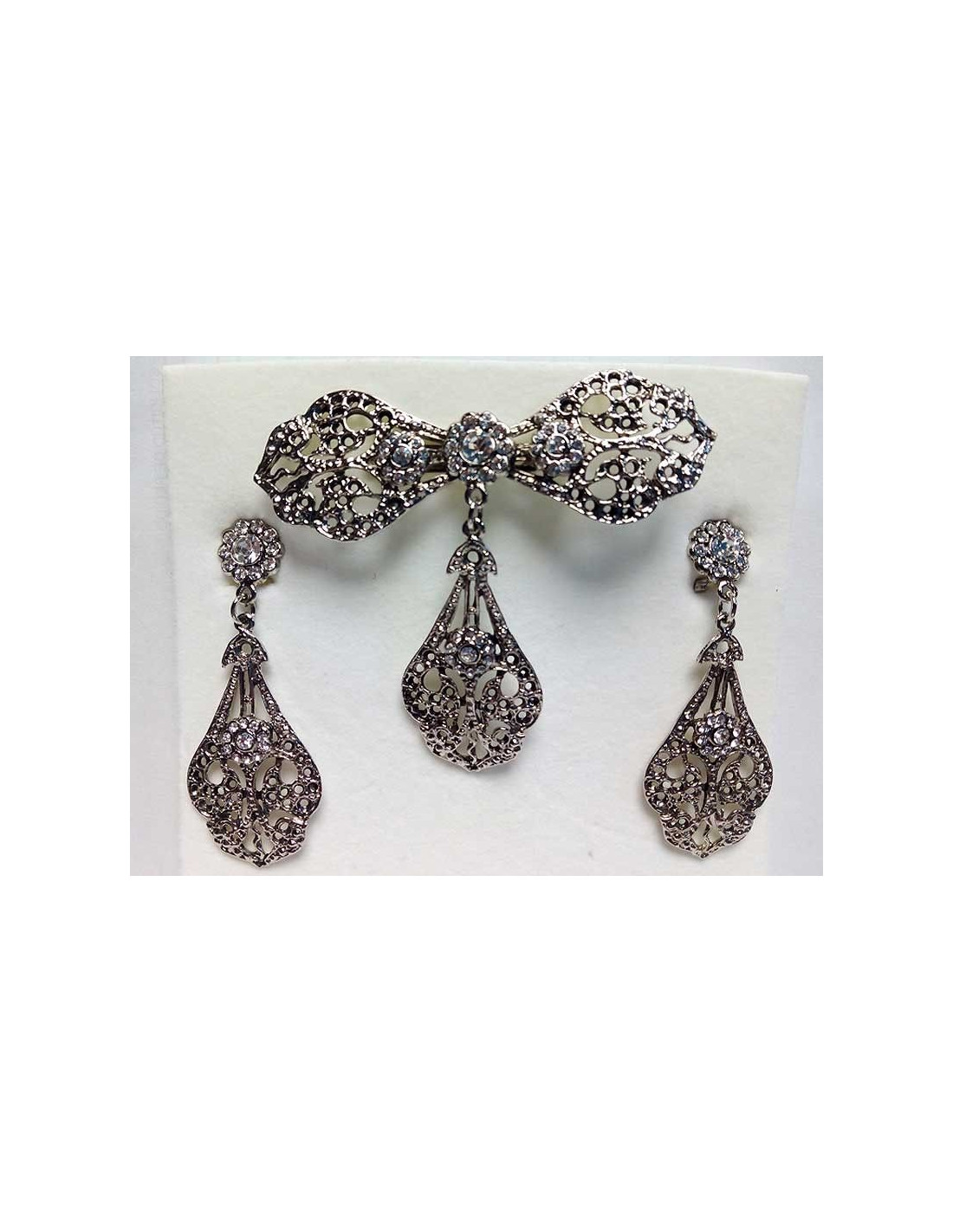 Conjunto para traje regional de pendientes de 6x2,5cm y broche de 8x6,5cm, adornados con piedras brillantes.