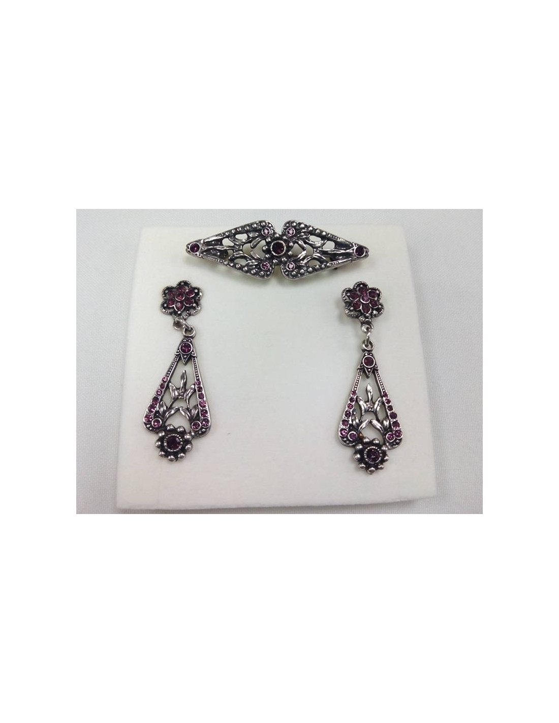 Conjunto de pendientes de 5x1,5cm y broche de 5x1,5cm para conjuntar tu traje regional, adornados con piedras de color.