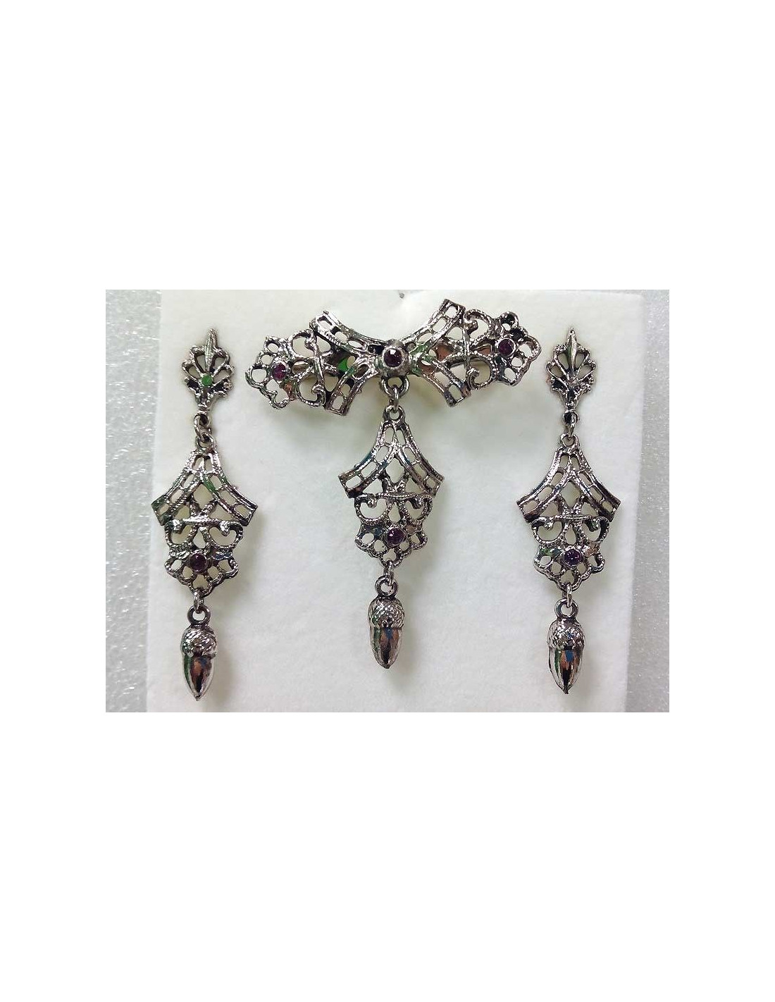Conjunto para traje regional de pendientes de 5,5x1,5cm y broche de 4,5x5,5cm, adornados con piedras brillantes.