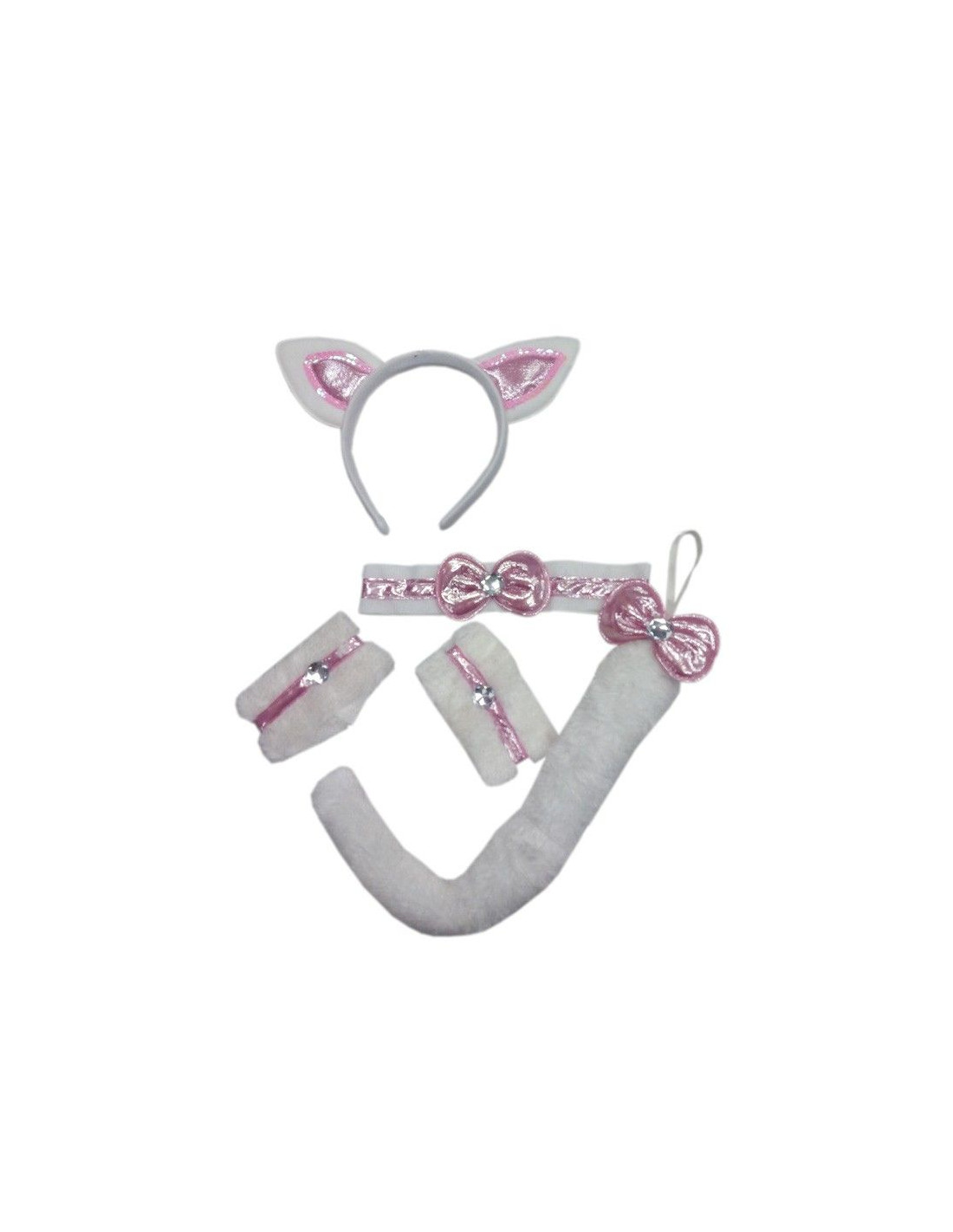 Set de conejita sexy para despedidas o noches picantes. Incluye diadema, cola, muñequeras y gargantilla, todo en tejido de pelo de dacha, decorados con lentejuelas y piedra blanca.