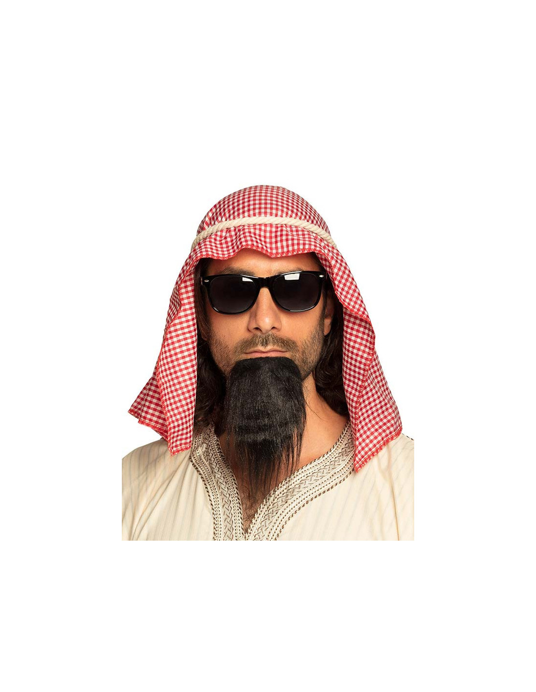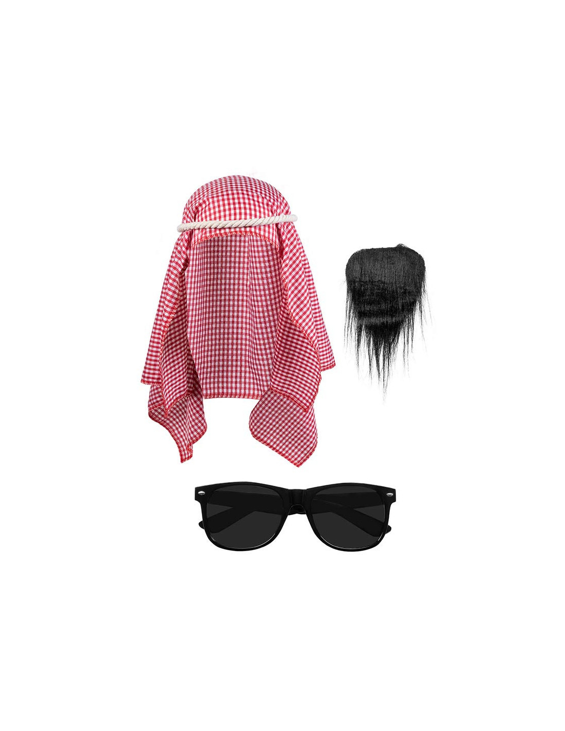 El conjunto Jeque árabe contiene pañuelo a cuadros rojos y blancos para la cabeza con cordón, perilla negra y gafas de sol negras.