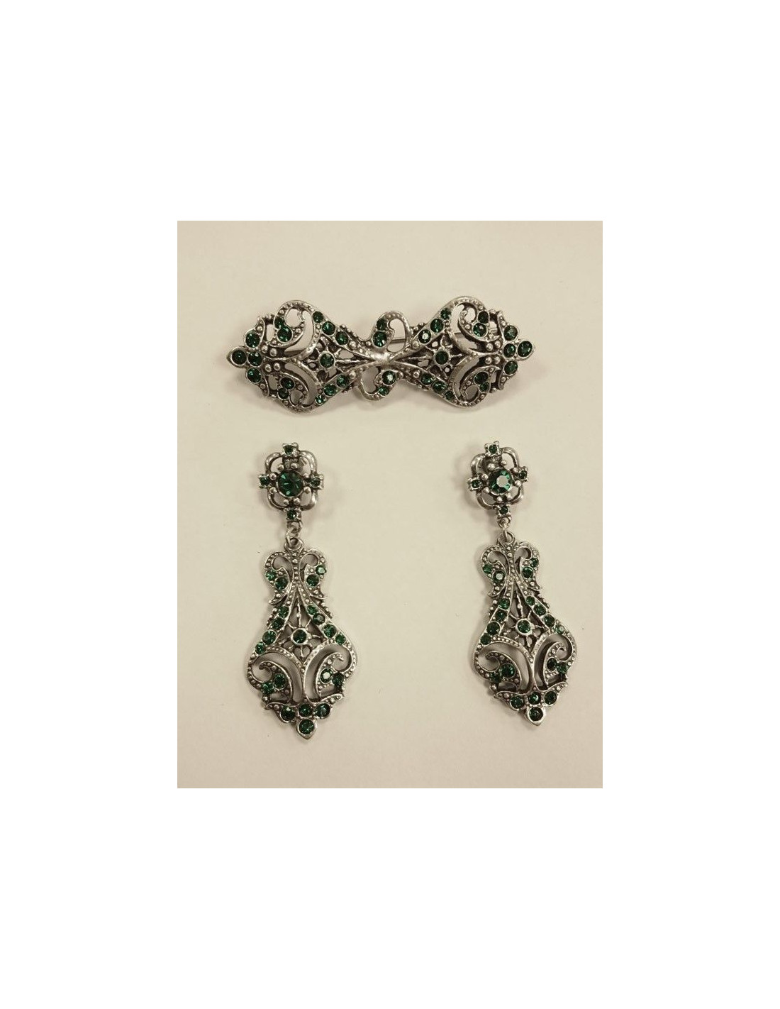 Conjunto de pendientes de 6x2,5cm y broche de 7x2,5cm.