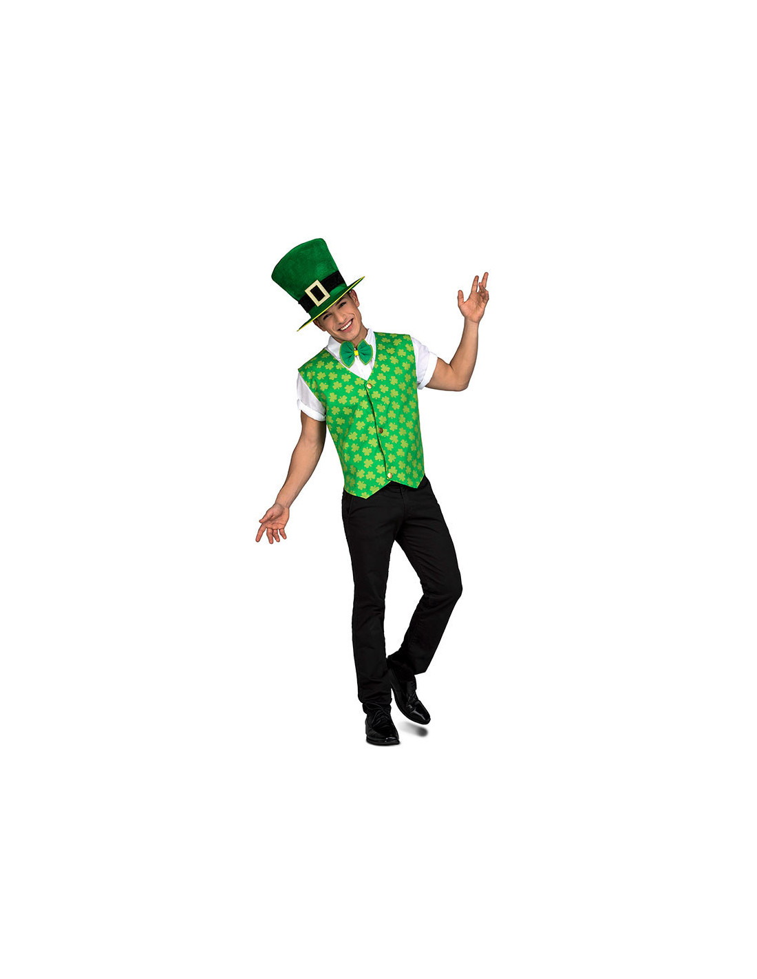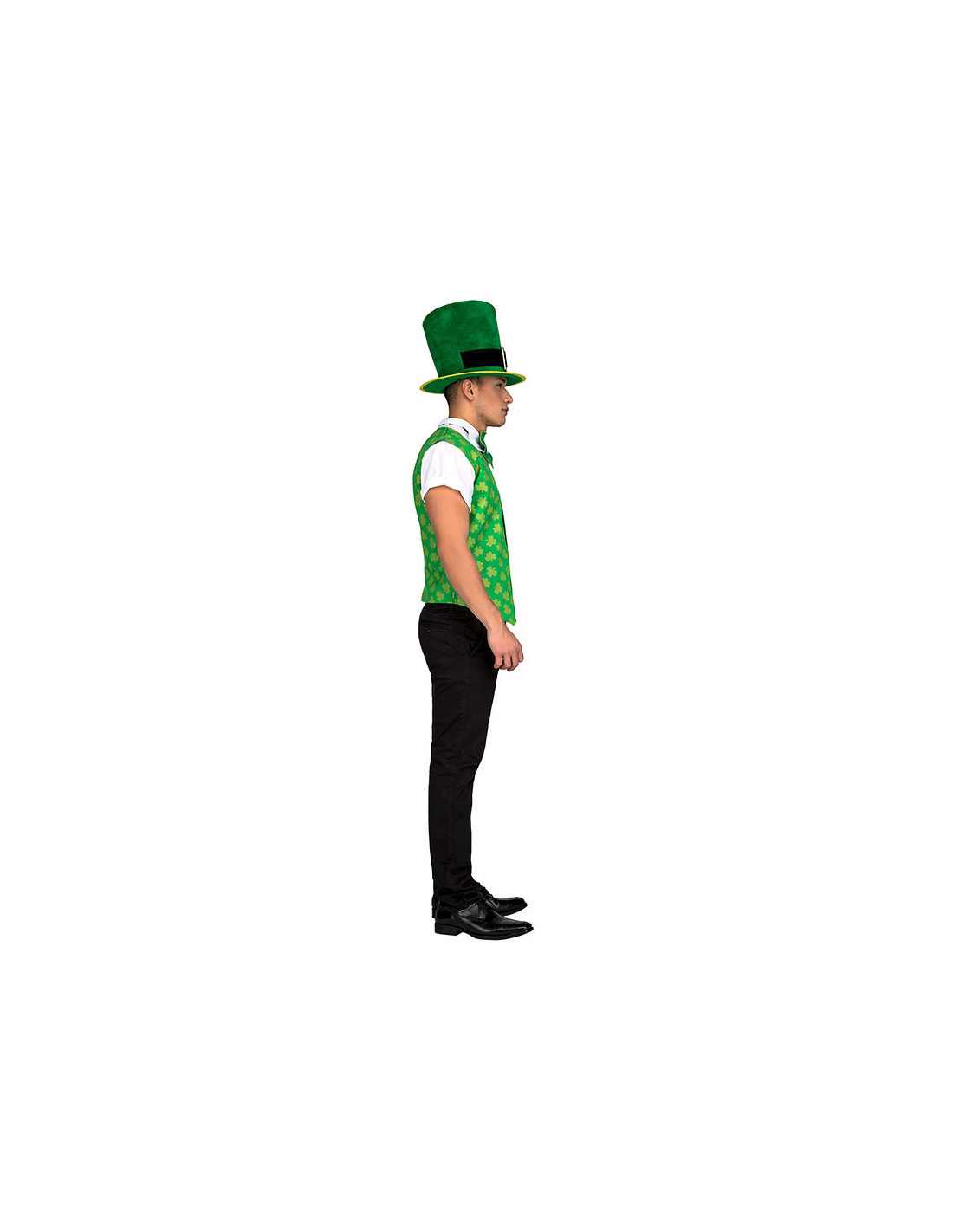 Conjunto San Patricio para hombre que incluye sombrero, chaleco y pajarita.