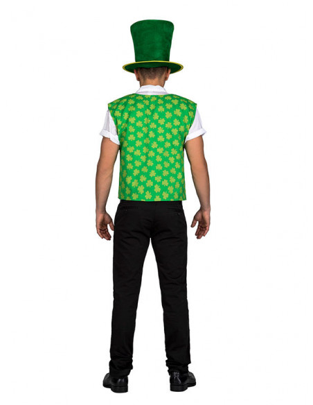 Este conjunto de San Patricio contiene un chaleco estampado con tréboles, pajarita verde y chistera.