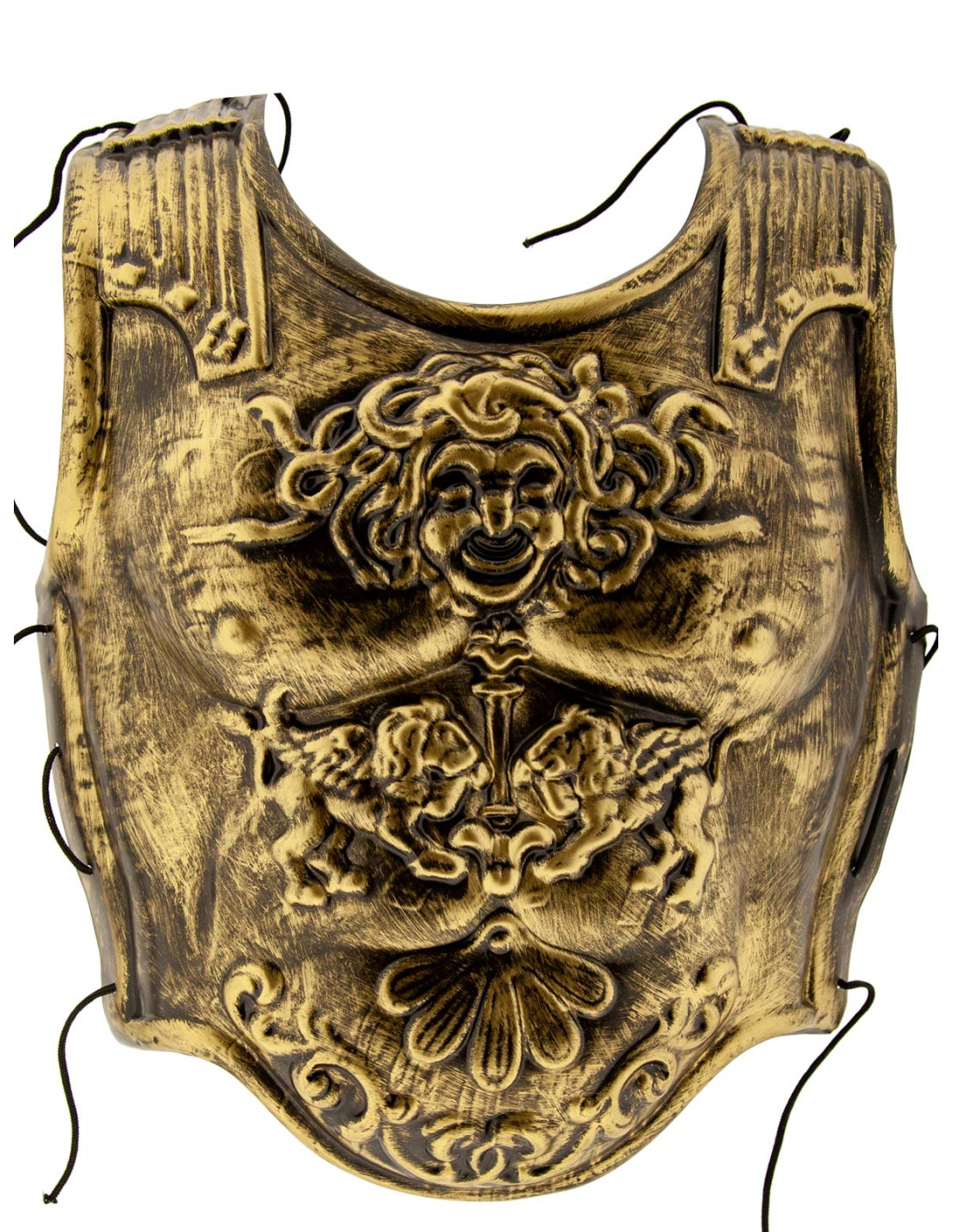 Coraza de romano envejecida para complementar tu disfraz de soldado romano en fiestas temáticas y eventos romanos.
