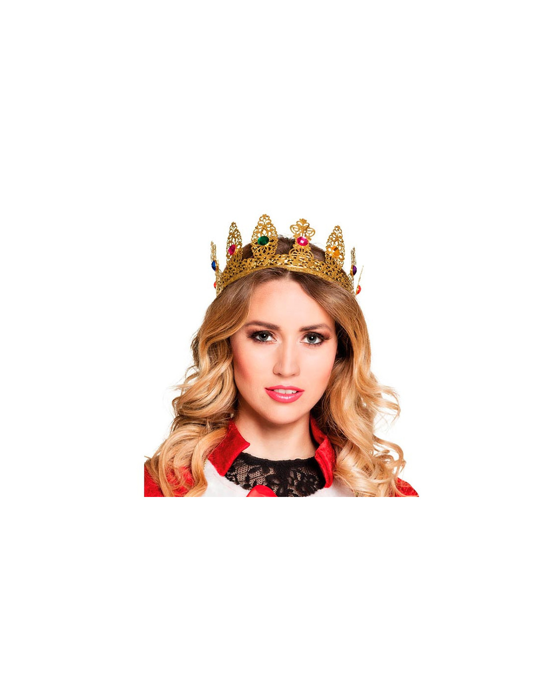 La corona de Reina con piedras falsas de colores es metálica y de color dorado. Para un contorno de cabeza de 52cm aproximadamente.
