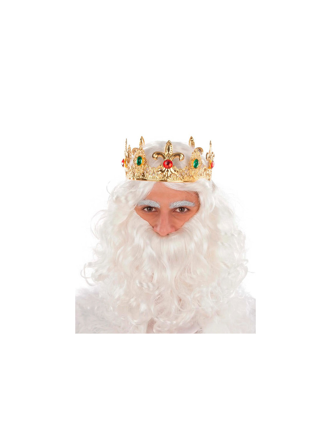 Esta corona de Rey es metálica y de gran calidad. Tiene un color dorado y piedras acrílicas en color rojo y verde. El contorno de la corona es de 57cm aproximadamente.