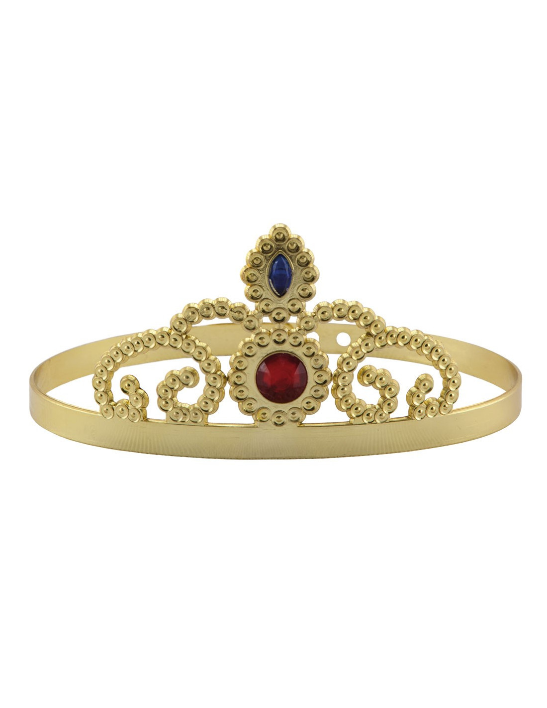 Corona reina dorada de plástico con un perímetro ajustable de entre 51 y 57 cm. Además contiene dos piedras de color pegadas a la corona.