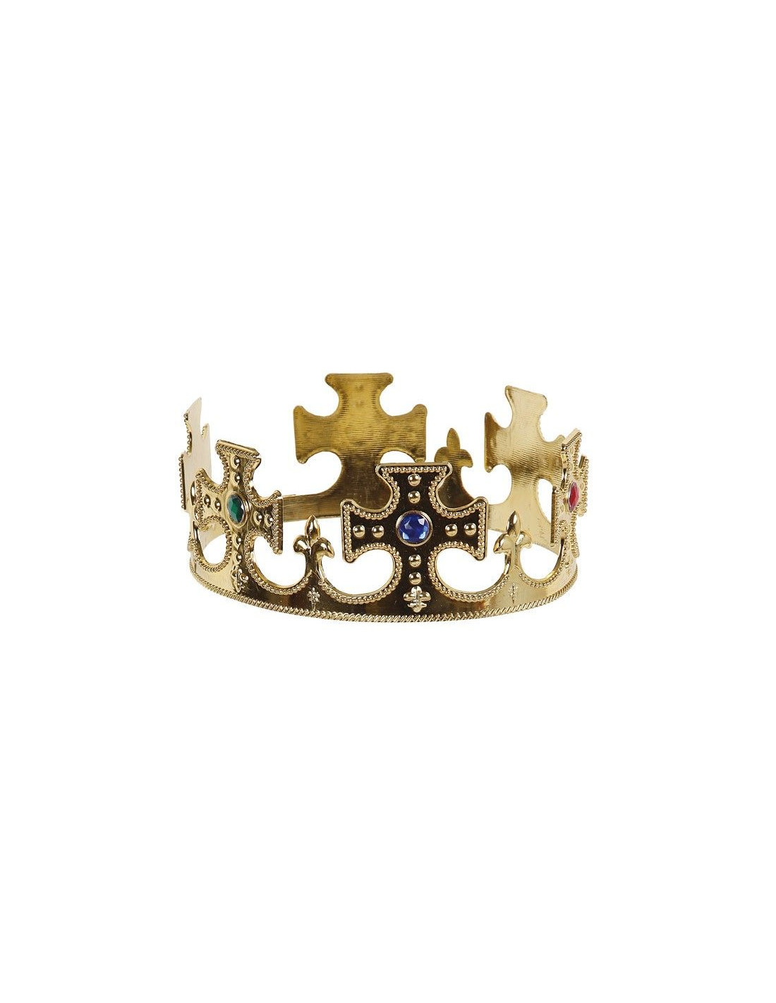 Corona de rey dorada, fabricada en plástico de pvc, con 6 florones de puntas con forma de cruz y decoradas con piedras acrílicas circulares simulando piedras preciosas.