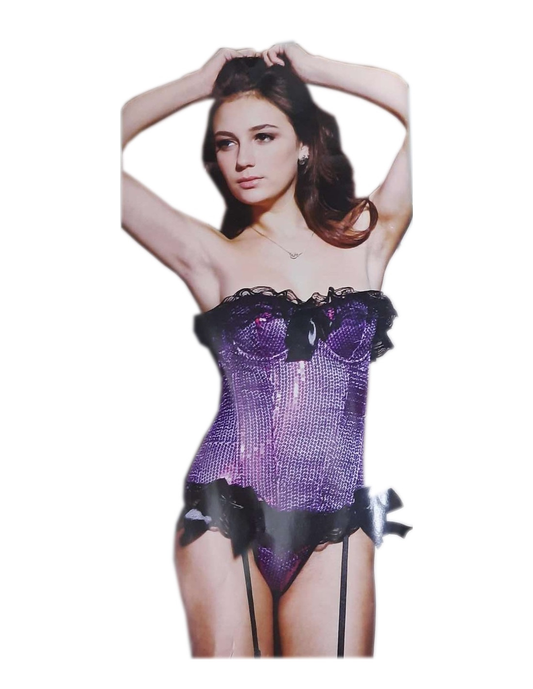 Corset de lentejuela cosida decorado con blonda y lacitos negros, conjuntado con tanga, también de lentejuela.