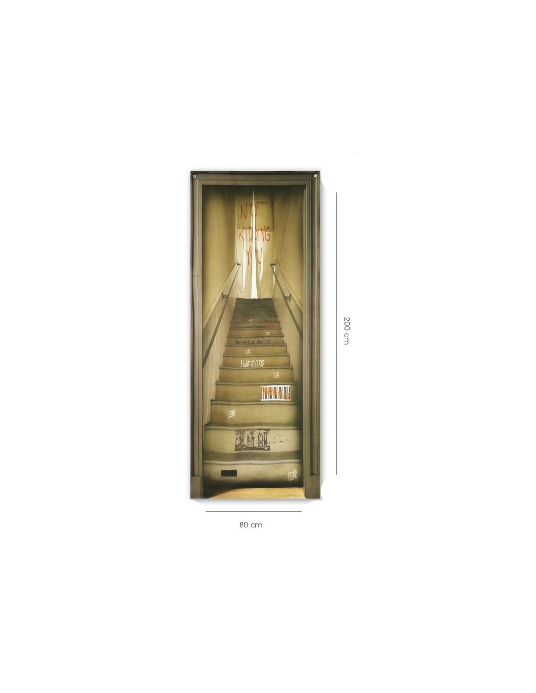 Decora tu fiesta de Halloween con esta cortina escaleras. Puedes colocarla en una pared, al final de un pasilloo sobre una puerta para simular unas inquietantes escaleras.