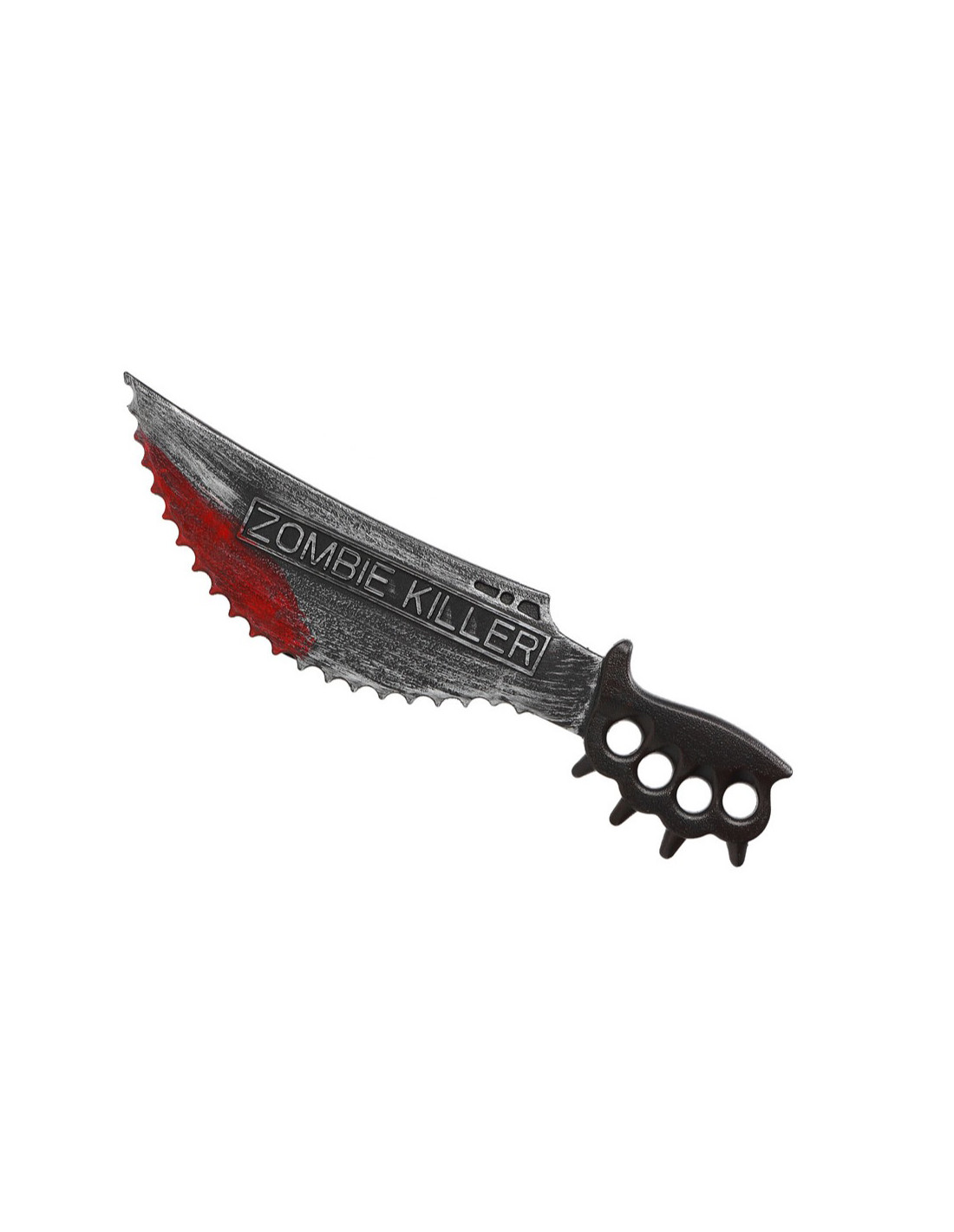 Cuchillo asesino de zombies que incluye un cuchillo de plástico con sierra. Mide 51cm de largo aproximadamente.