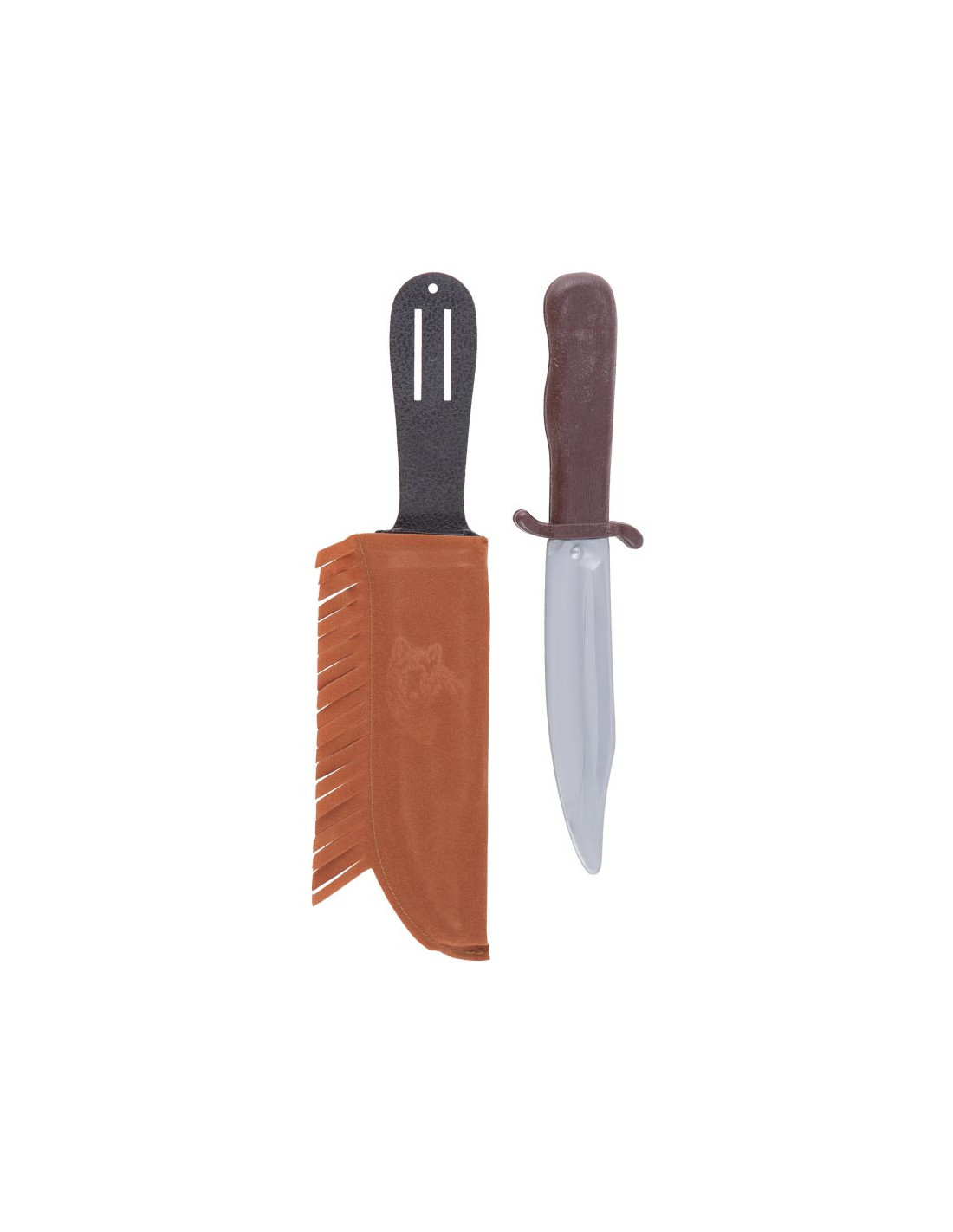 Cuchillo de indio con funda para completar tu disfraz de apache. Fabricado en plástico, incluye una funda marrón con flecos decorativos.