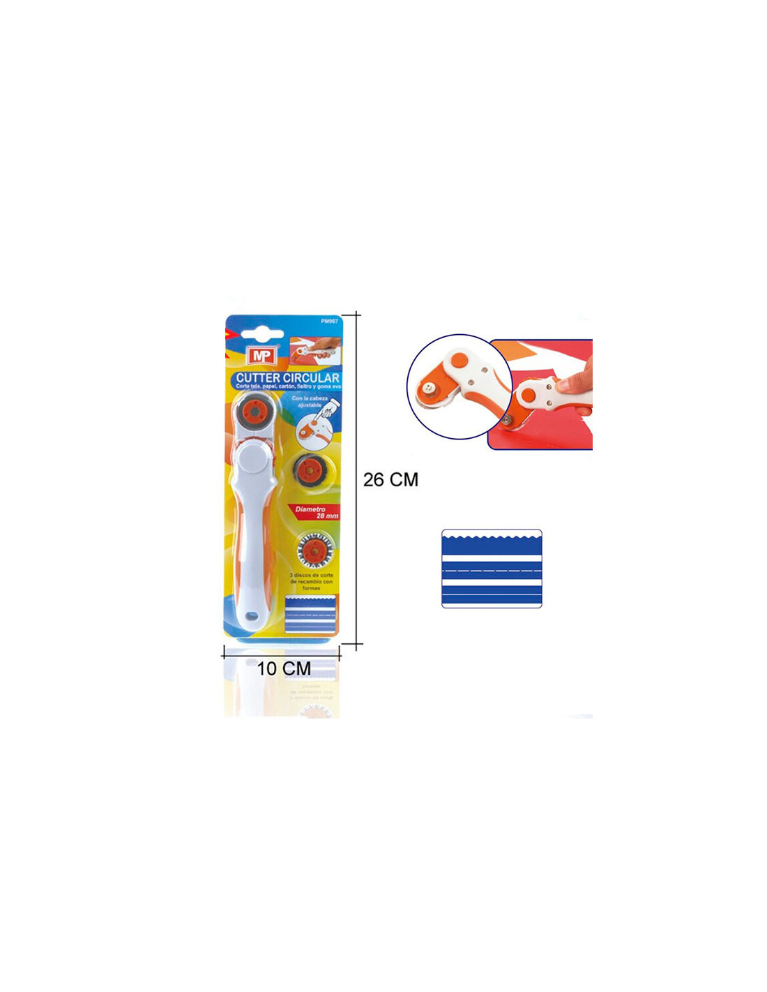 Cutter rotatorio para telas, fieltro, papel, cartón y goma eva. Utiliza una base de corte y coloca la pieza que quieras cortar sobre ella. Es muy sencillo de usar y dispone de tres discos de corte de recambio con distintas formas según el resultado deseado. Los discos tienen un perímetro de 28mm y el cabezal es ajustable.