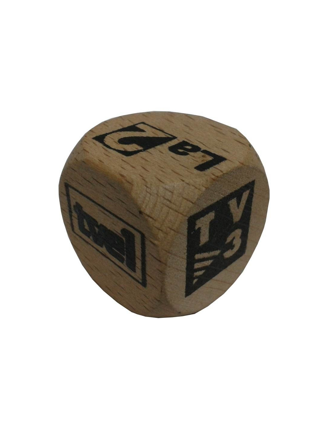 Dado de 3x3x3cm de madera, estampado con diferentes cadenas de tv antiguas representado los números de un dado.