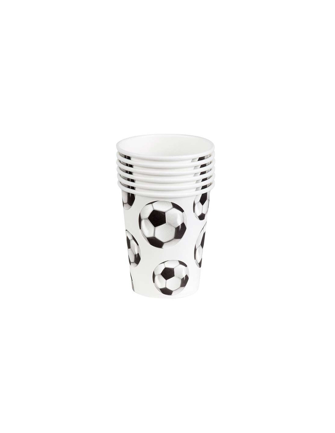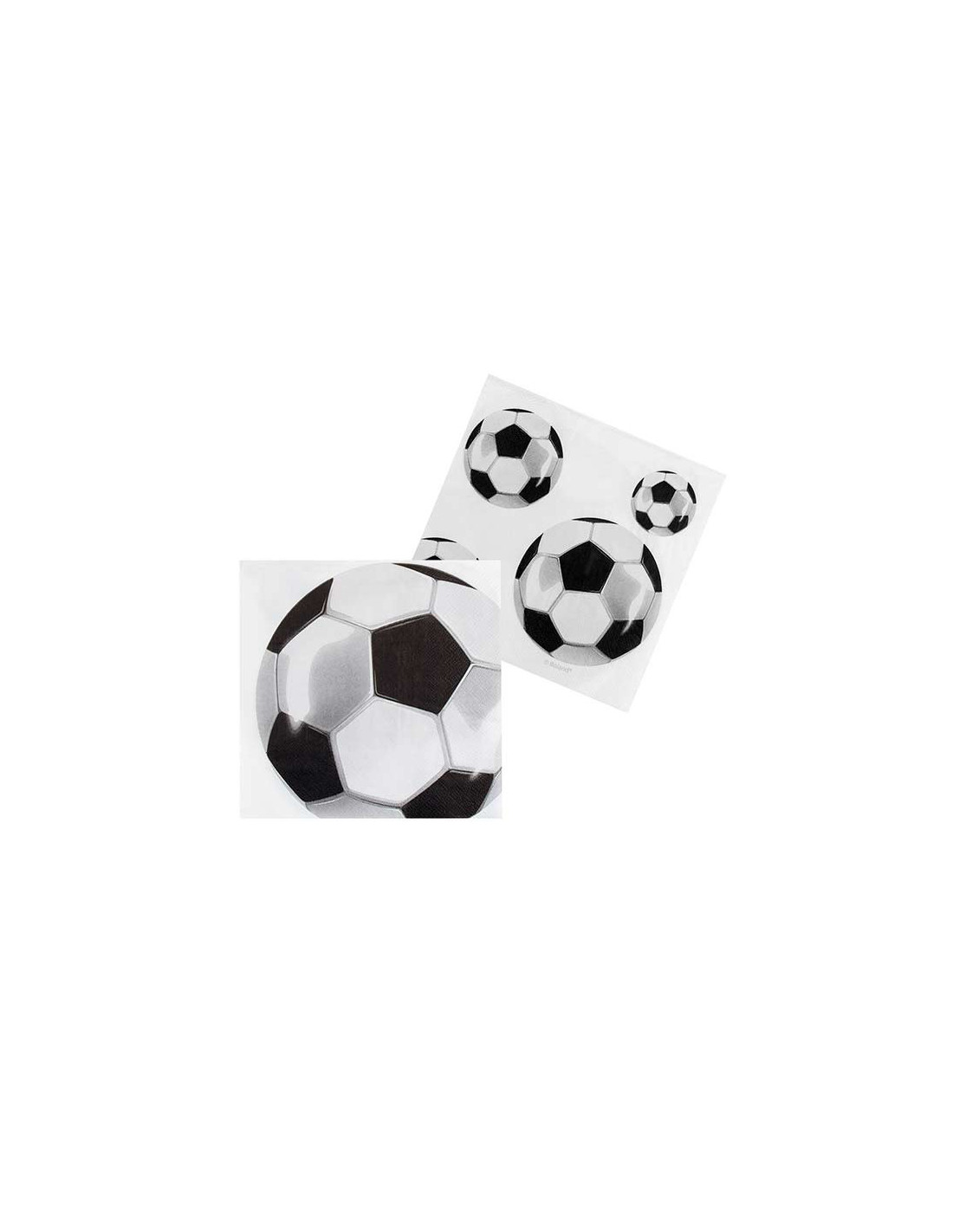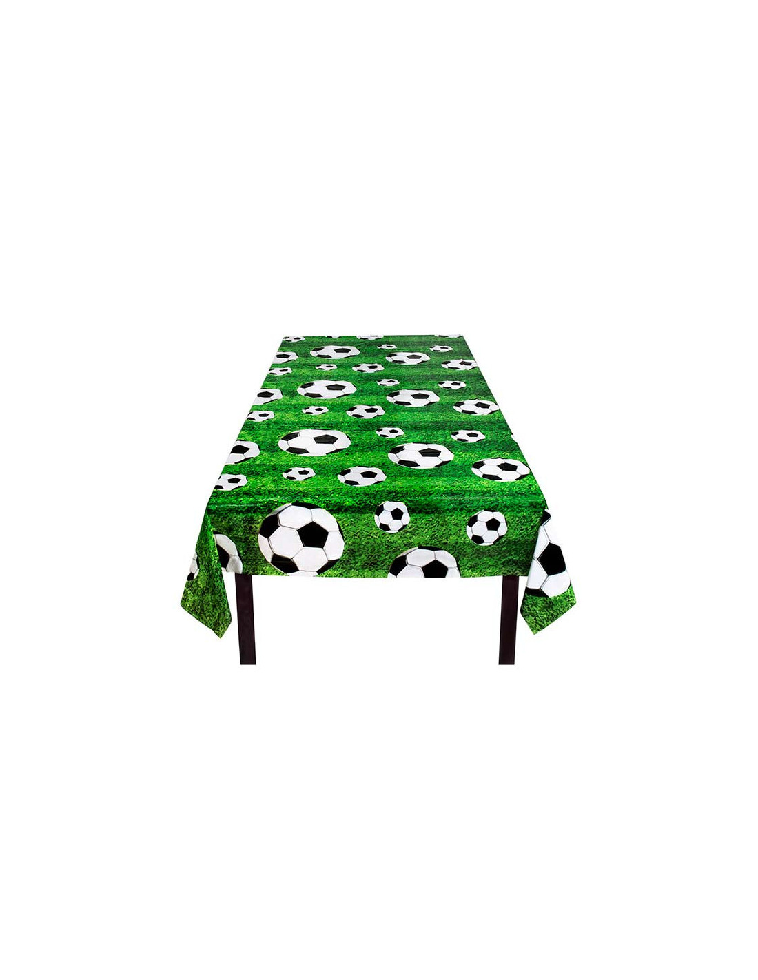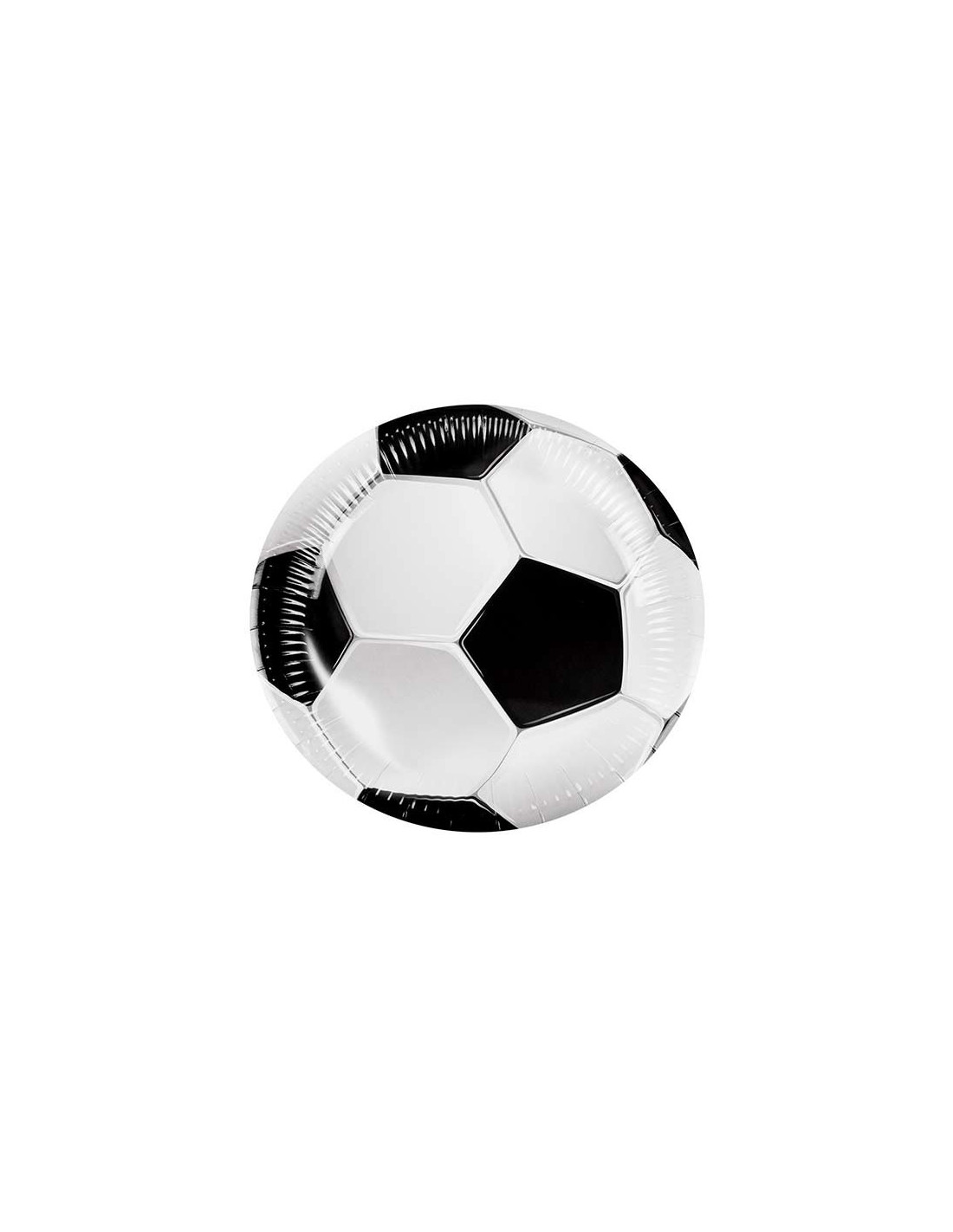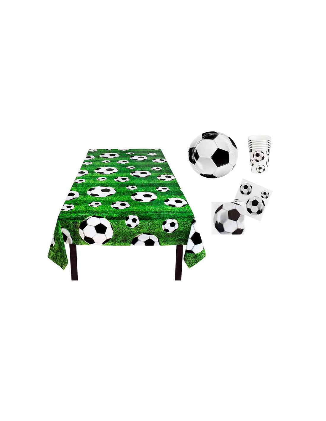 El set de decoración fútbol fiesta temática contiene 6 platos de cartón de 18cm de diámetro, 6 vasos de cartón de 25cl, 12 servilletas de 33x33cm de papel y un mantel de plástico que mide 120x180cm. Todo ello estampado con balones de fútbol.