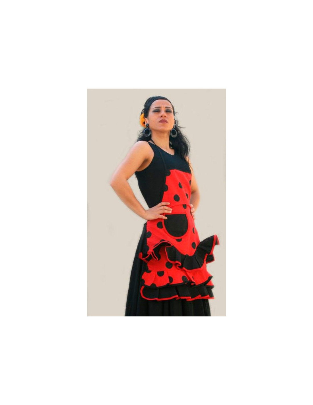 Delantal andaluza con topos negros y tres volantes en la parte inferior.