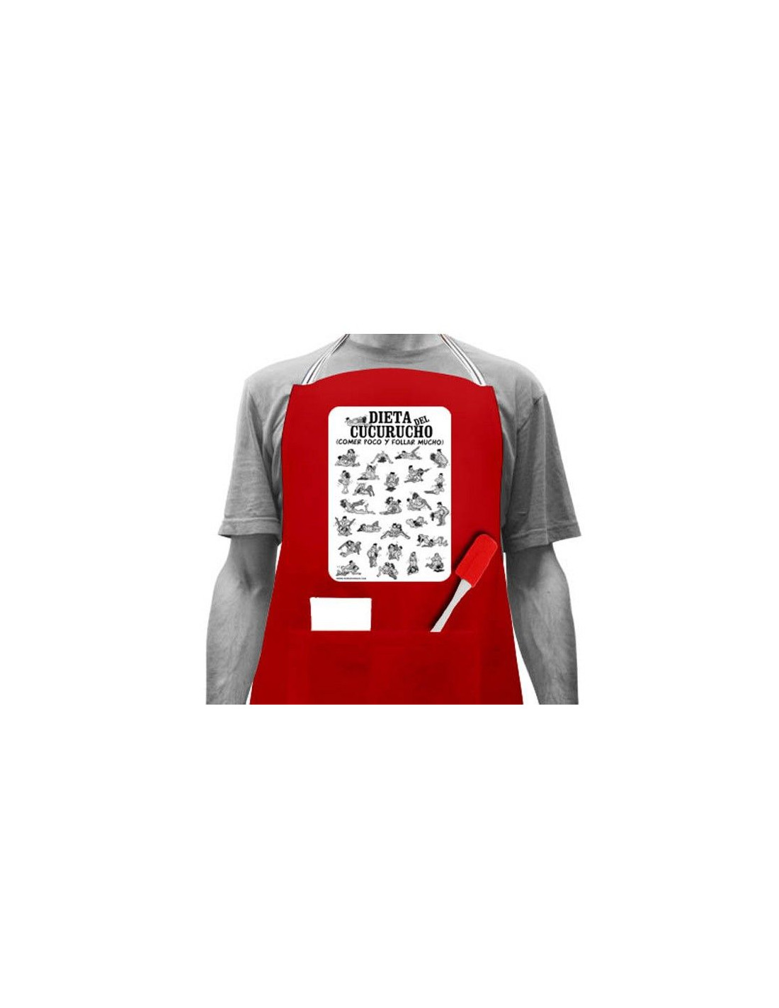 Prepara tus mejores recetas y haz que tu pareja se pase la comida pensando en el postre con este delantal divertido de cocinero. Incluye un original y provocativo delantal divertido érotico, estampado con diferentes posturas eróticas y con la frase "dieta del cucurucho", con bolsillo para guardar tus herramientas y paleta de silicona para que remuevas tus mejores creaciones culinarias.