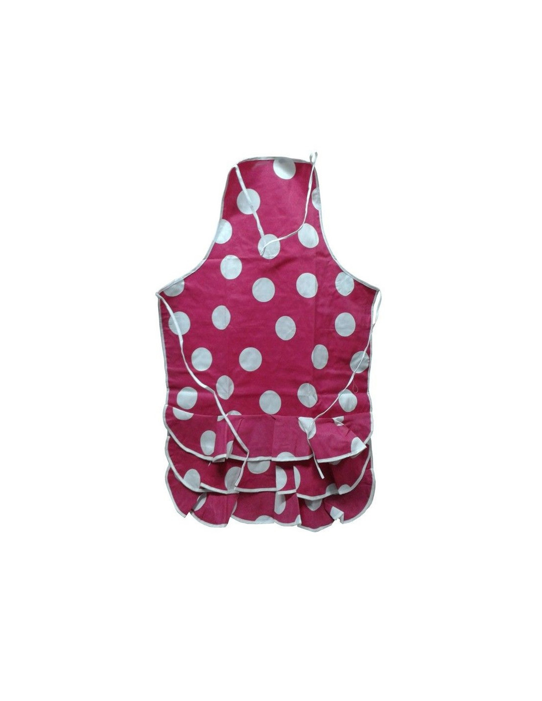 Delantal Delantal flamenco rosa con topos blancos de 6cm de diámetro y fondo fucsia, base de tres volantes.