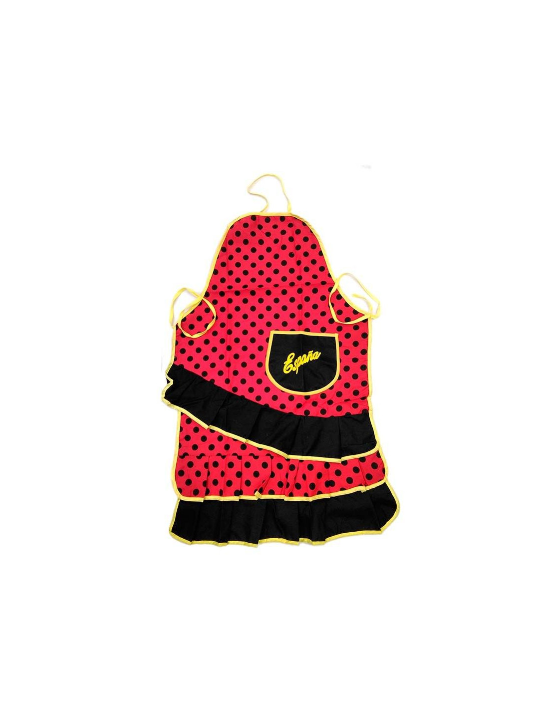 Delantal sevillano típico español con el que saldrás triunfador en tus mejores comidas. En color rojo a topos negros, este delantal sevillano incluye un bolsillo con el estampado de la palabra "España" en color amarillo fosforito y unas dimensiones de 77cm de longitud.