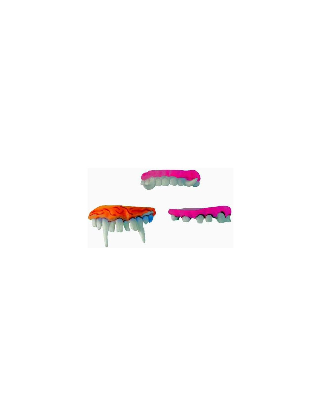 Dientes postizos de mentira para causar auténtico terror en tu fiesta de Halloween. 3 modelos diferentes de dentaduras disponibles: uno similar a la del hombre lobo o drácula, y dos más para convertirte en orco o cualquier personaje de miedo.