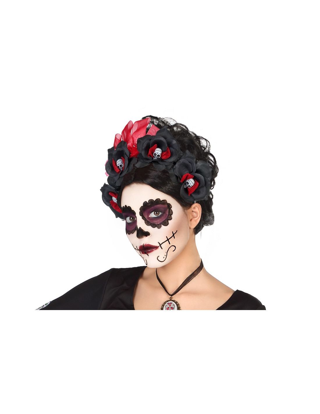 Incluye una diadema Catrina con flores negras con detalles en rojo y calaveras.