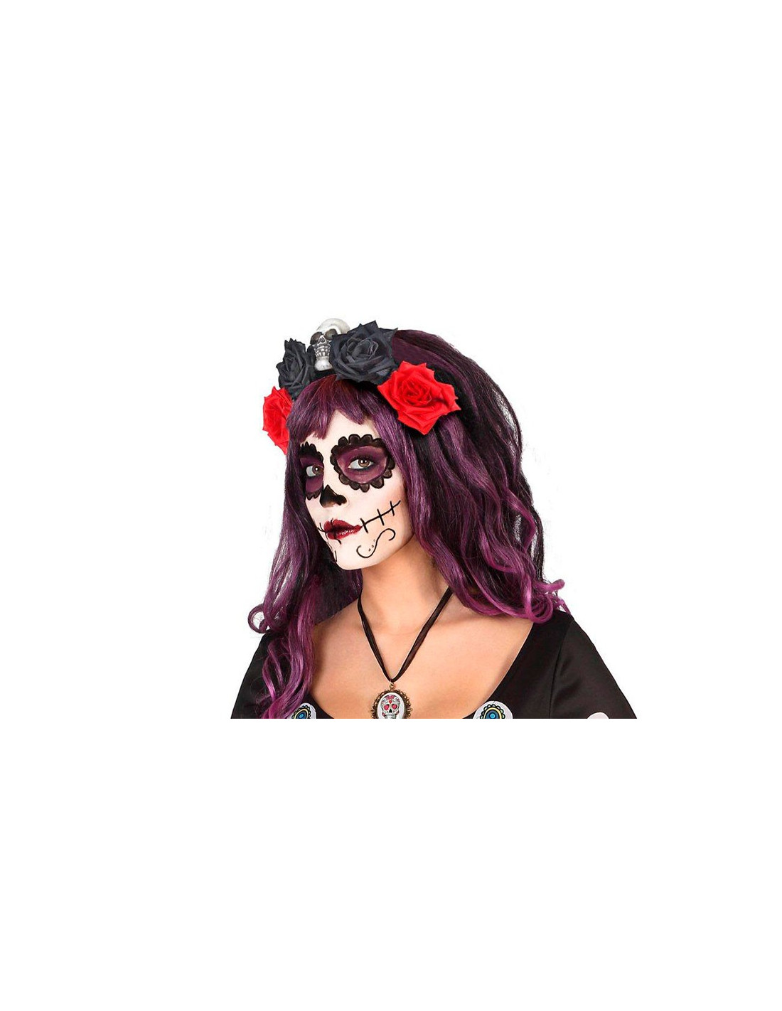 Incluye diadema con flores negras, rojas y una calavera blanca en el centro.