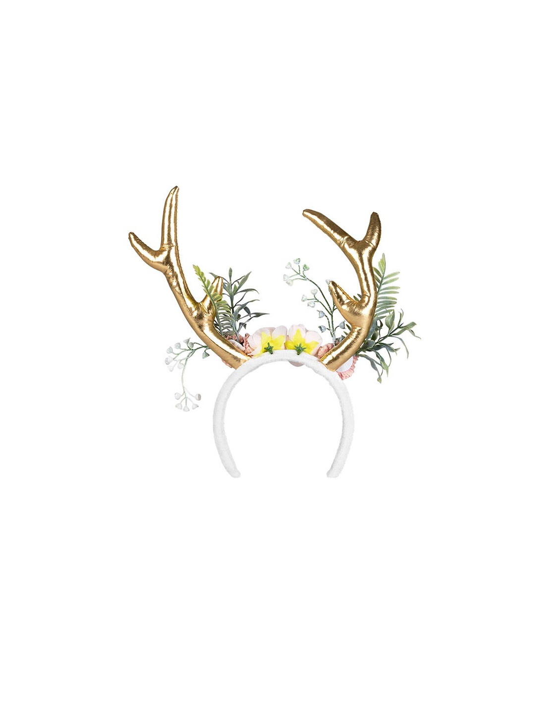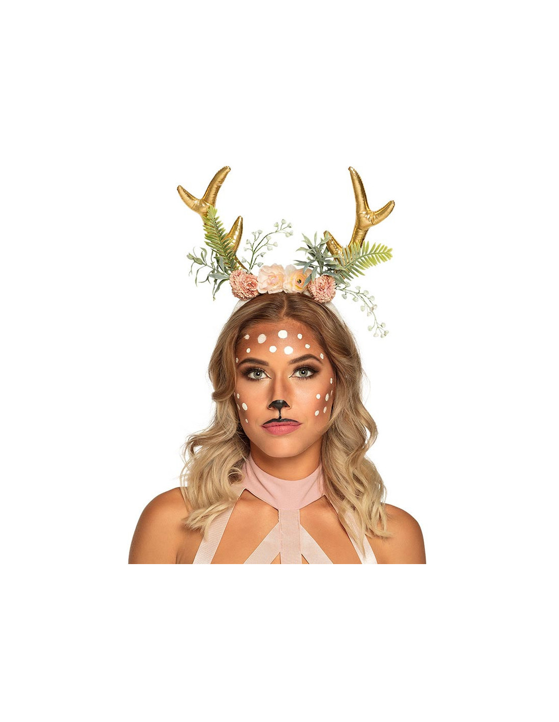 Diadema ciervo que incluye una diadema con cuernos de ciervo acolchados, flores y hojas.