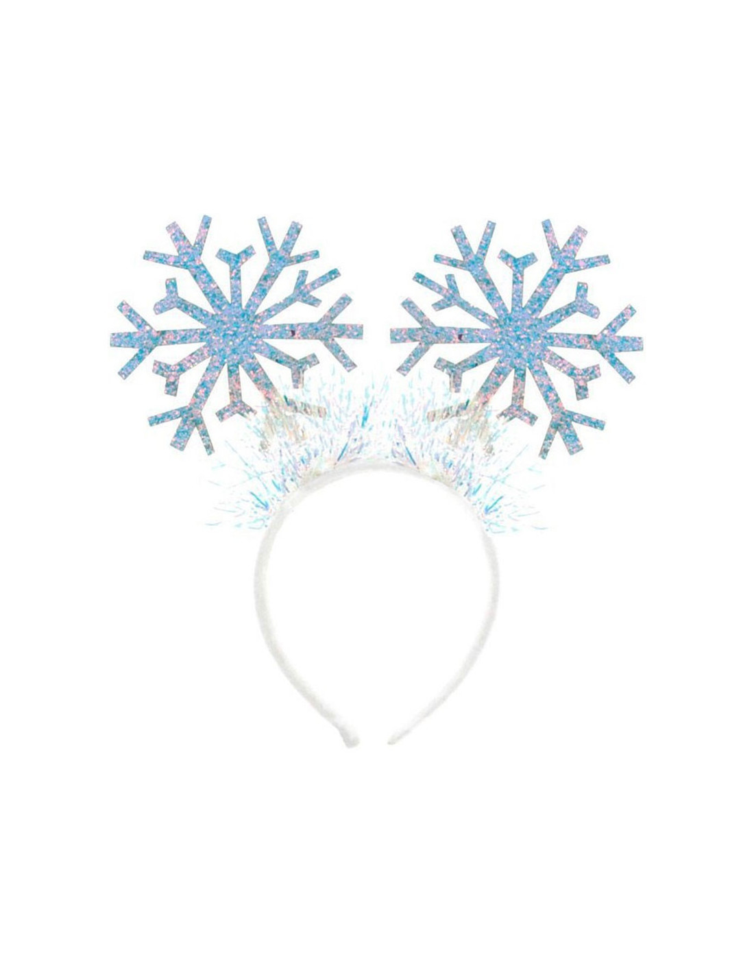 Diadema copos de nieve irisados que incluye una diadema de plástico blanca con dos copos de nieve.
