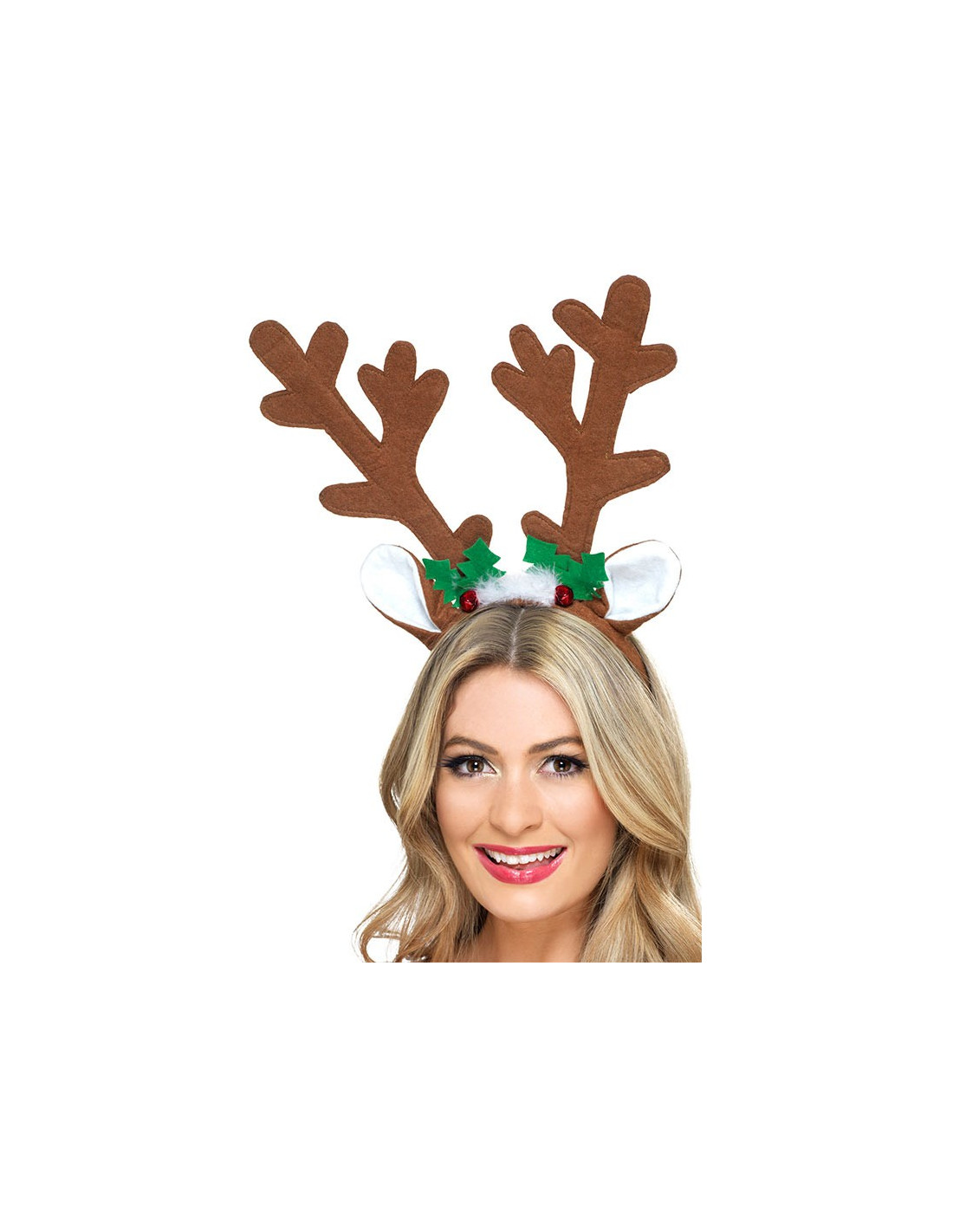 Diadema de reno marrón que incluye una diadema de tela con cuernos, orejas y detalles.