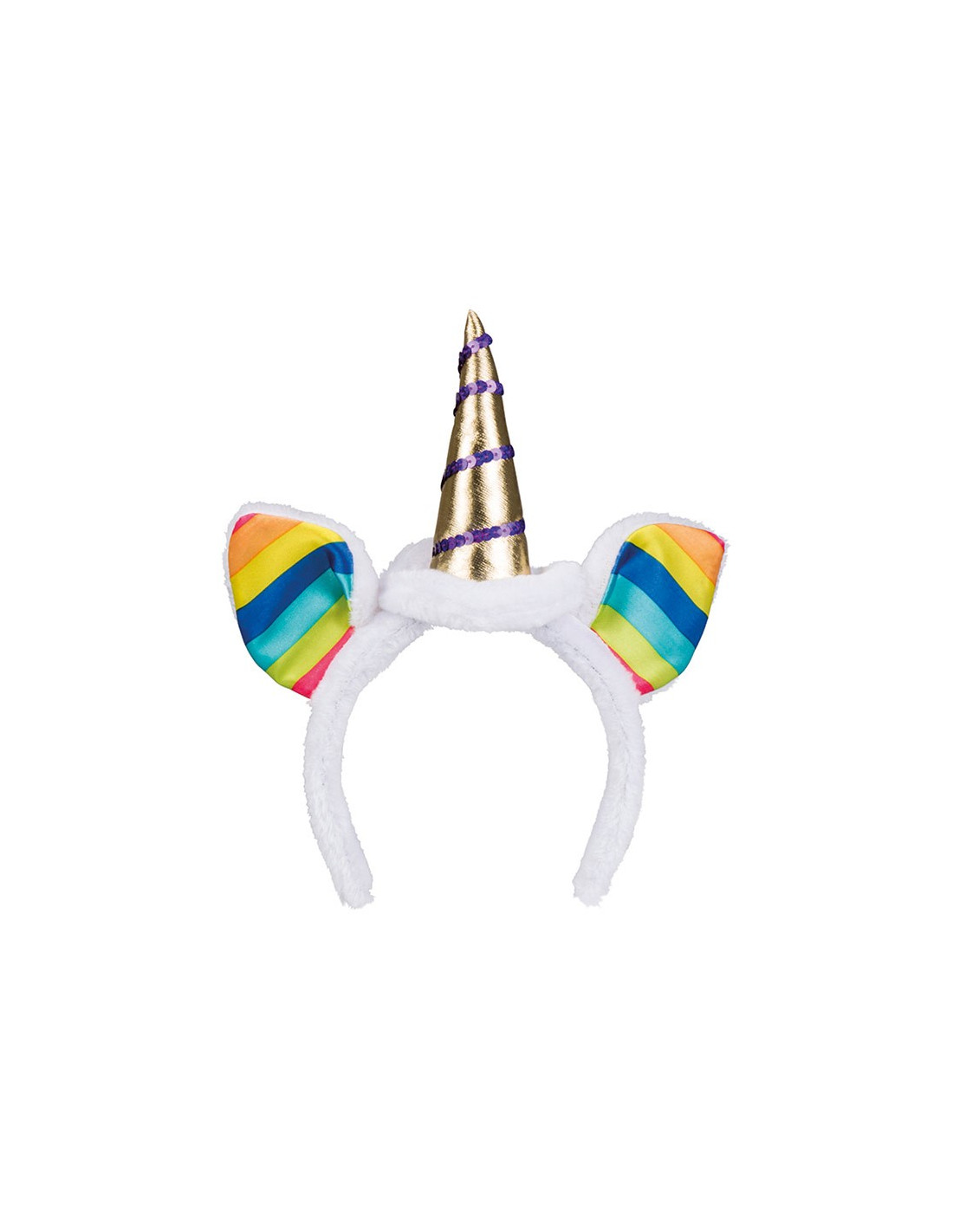 Viaja a un mundo de fantasía con esta preciosa diadema de unicornio ideal para disfrazarte junto a tus amigas. La diadema de unicornio está forrada de pelo blanco, tiene dos orejas con tejido multicolor y un cuerno dorado con pasamanería de lentejuelas moradas. Ideal para disfrazarte en grupo en Carnaval o despedidas de soltera.