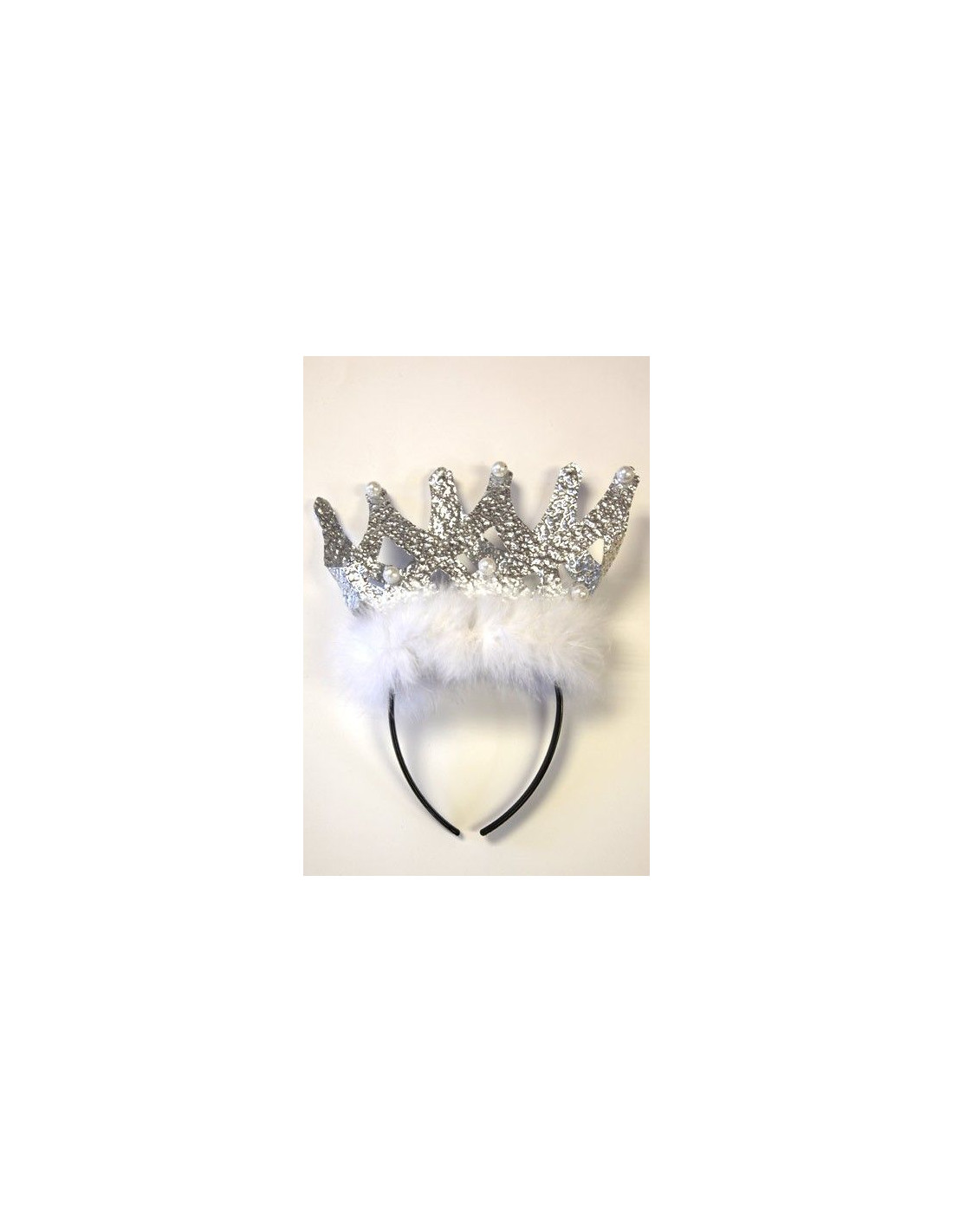 Diadema plateada de princesa con una corona en la parte superior y espumillón blanco.