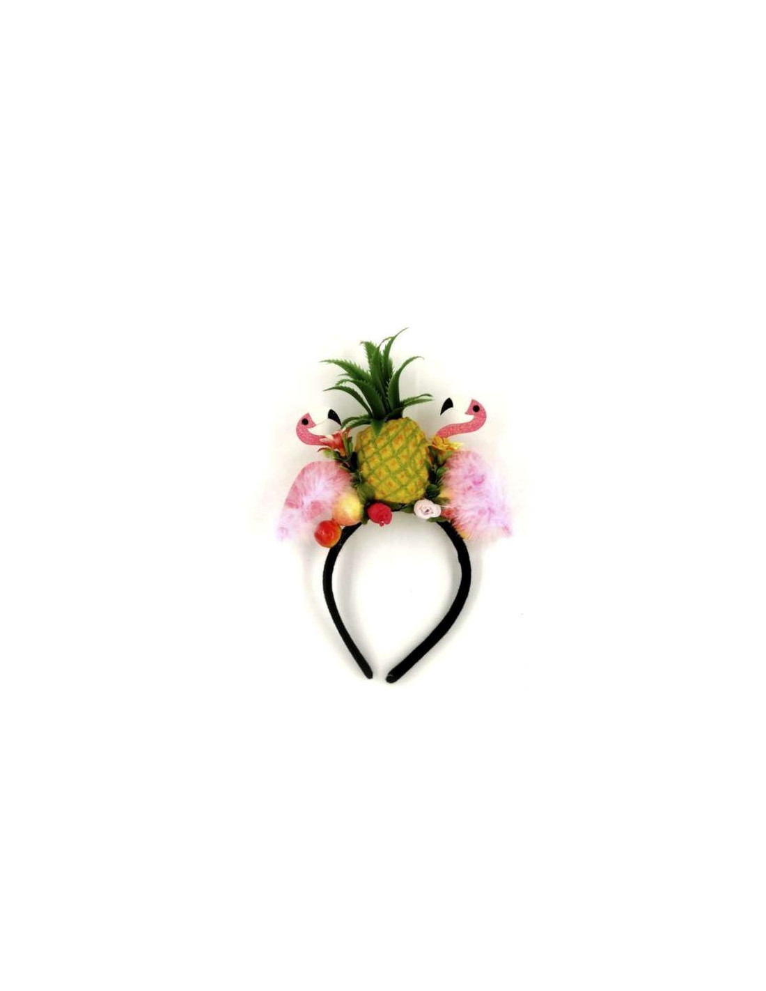 Diadema rumbera tropical decorada con frutas de plástico, flores de tela y dos flamencos.