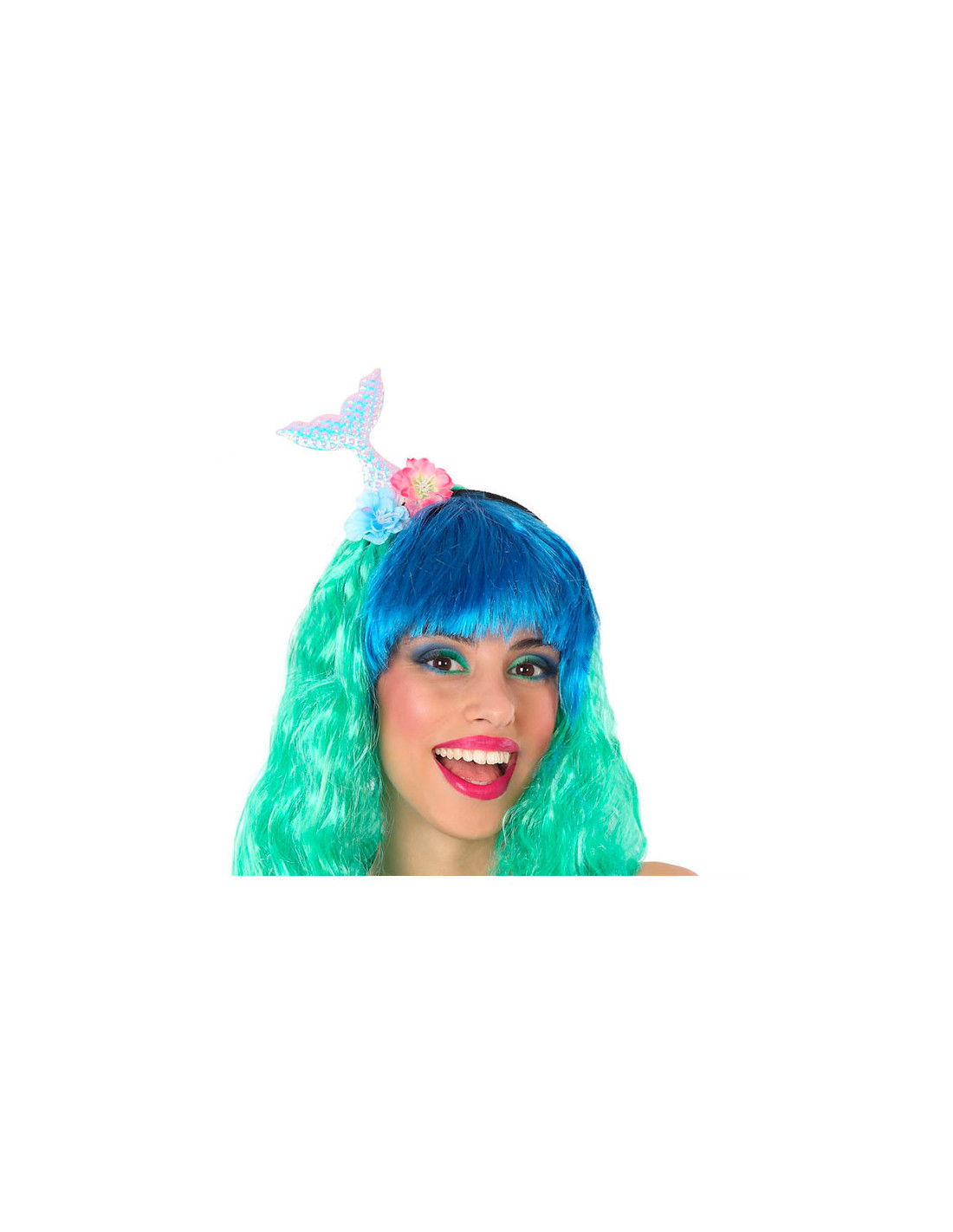 Original diadema sirenita decorada con la cola de una sirena y dos flores.