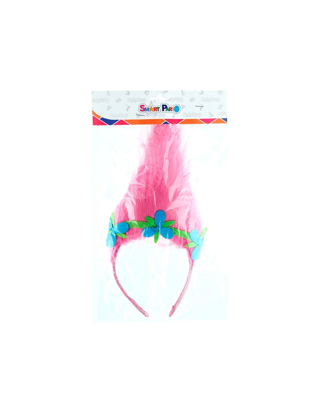 La diadema Trolls rosa consta de una diadema forrada de tela y pelo rosa.