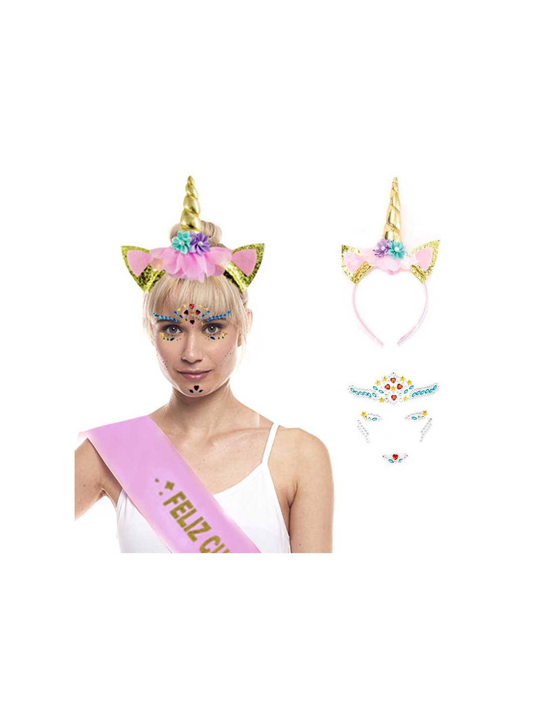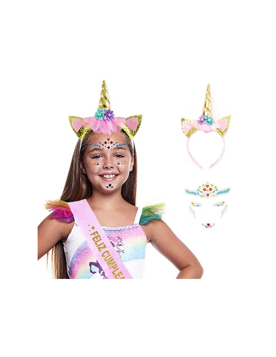 Diadema unicornio con joyas faciales que incluye una bonita diadema con orejas, flores y cuerno, y brillantes para pegar como maquillaje en el rostro.