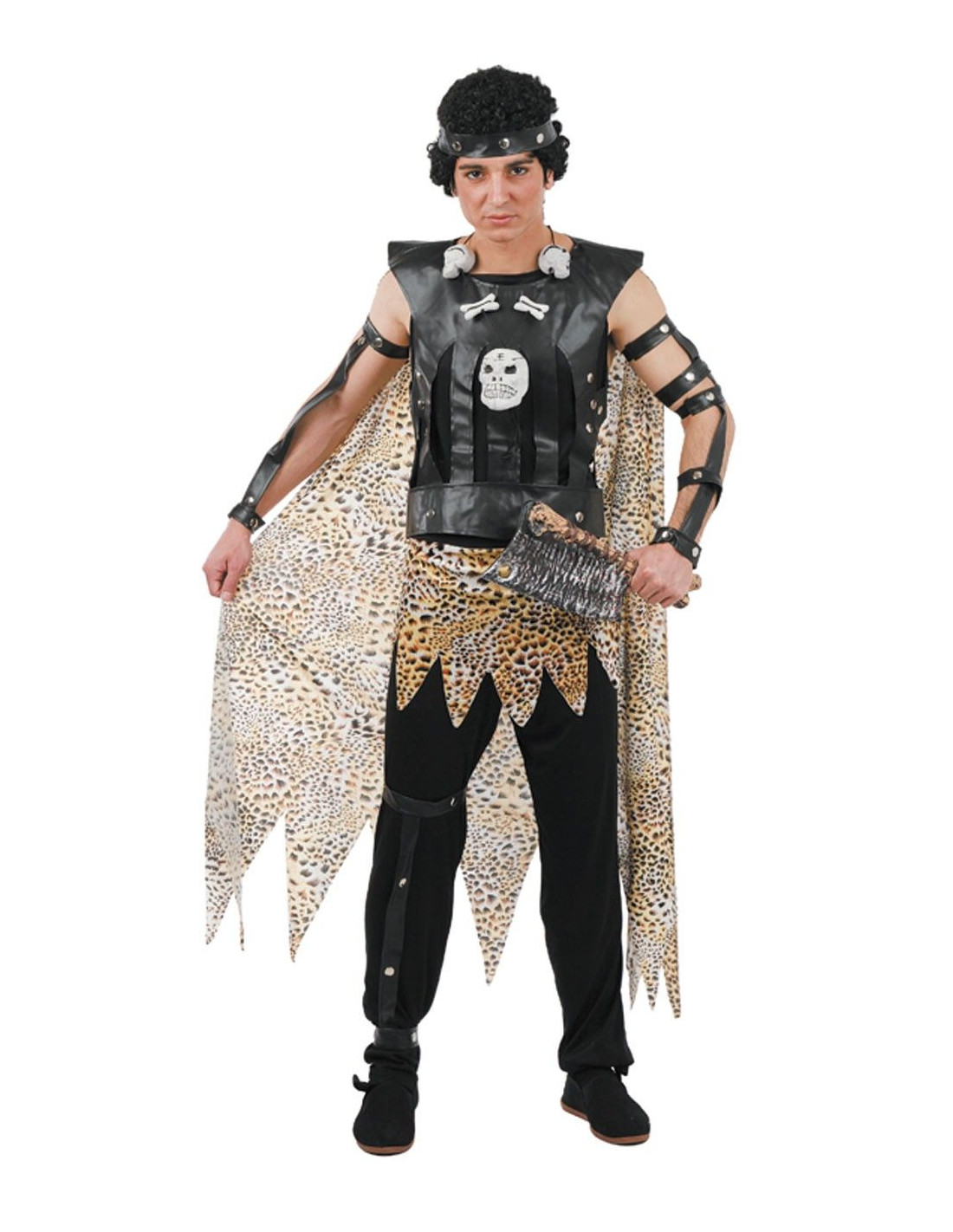 Disfraz Rey Africano hombre incluye diadema, manguitos para brazos y pierna de polipiel negra con remaches, falda y capa estampado como piel de leopardo, pechero de polipiel negra y mono elástico negro.