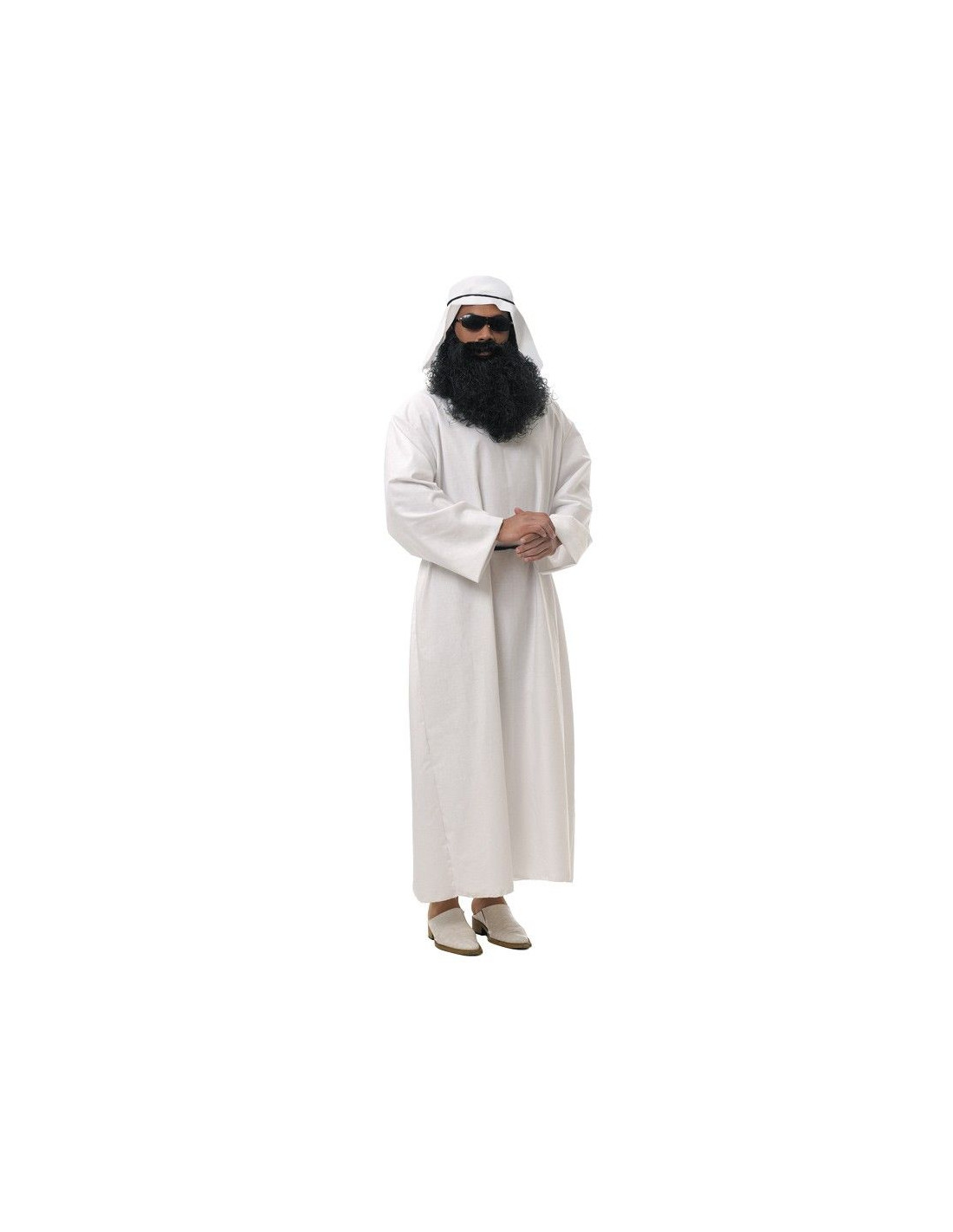 Disfraz de jeque árabe para adulto con el que podrás demostrar el poder del petróleo en tus fiestas más divertidas. Incluye un original disfraz de jeque árabe para adulto, compuesto por una túnica blanca de manga larga fabricada de stretch, un pañuelo blanco con cordón para sujetar a la cabeza que hace las veces de turbante, y un cordón a modo de cinturón para la cintura.