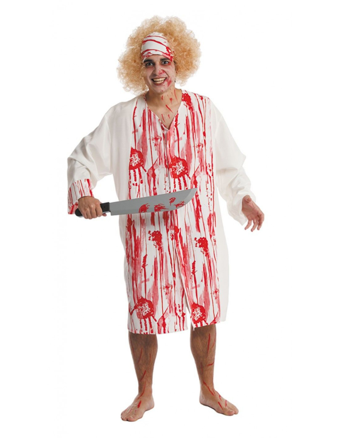 Disfraz de caníbal incluye bata de strech blanco con delantero manchado de sangre. No incluye peluca.