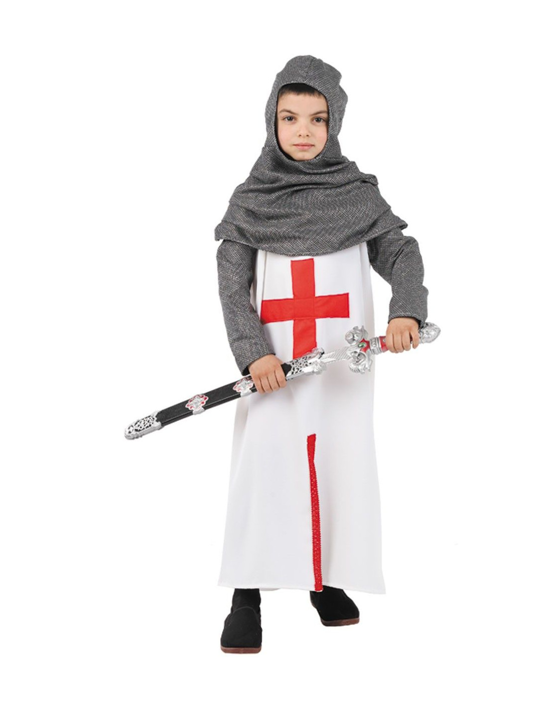 Disfraz de cruzado medieval para niño con el que los más peques de la familia podrán vivir sus mejores ferias medievales. Incluye un disfraz de cruzado medieval para niño, compuesto de capucha estilo cota de malla y túnica blanca con la cruz de la orden de los cruzados.