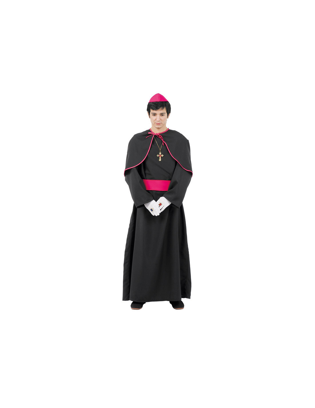 Disfraz de Cura monseñor adulto compuesto por bonete de color fucsia, capelina rematada también en color fucsia, túnica negra y fajín fucsia.