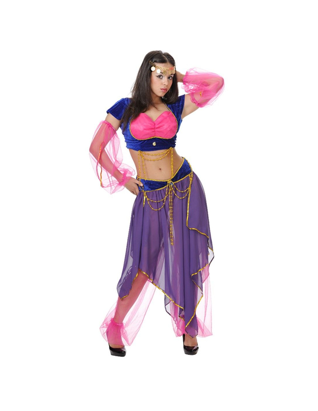 Mueve tus caderas y fascina a la audiencia con este disfraz de danza del vientre. El traje incluye top en terciopelo azulón y pecho en rosa con el detalle de la cadena de plástico, manguitos de gasa rosa y falda-pantalón de gasas con cinturilla en terciopelo y cadena de plástico.
