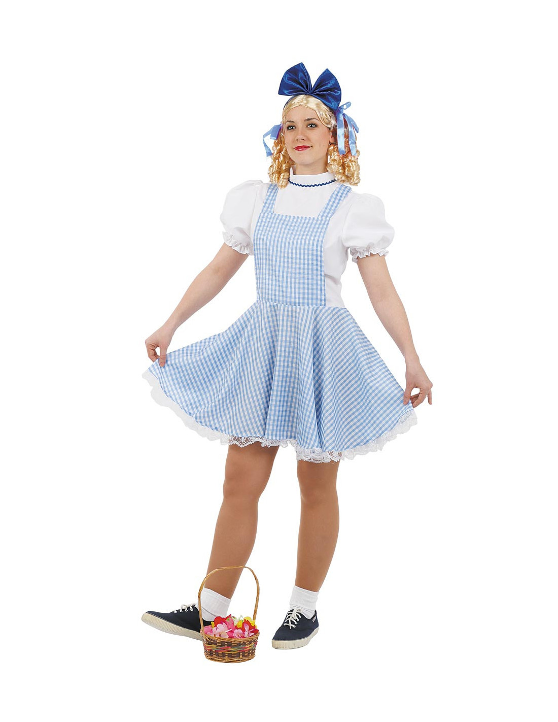 Disfraz de Dorothy, que incluye: Vestido con camisa blanca con pichi y falda de cuadros blancos y azules y lazo azul.