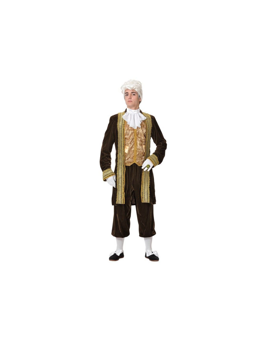 Disfraz de época barón para acudir a las mejores fiestas acompañado de tu baronesa. Incluye chaleco en oro con blonda de color marrón y detalles en oro, chaqueta de terciopleo marrón rematada con pasamanería oro, chorrera blanca y pantalón en terciopelo marrón.